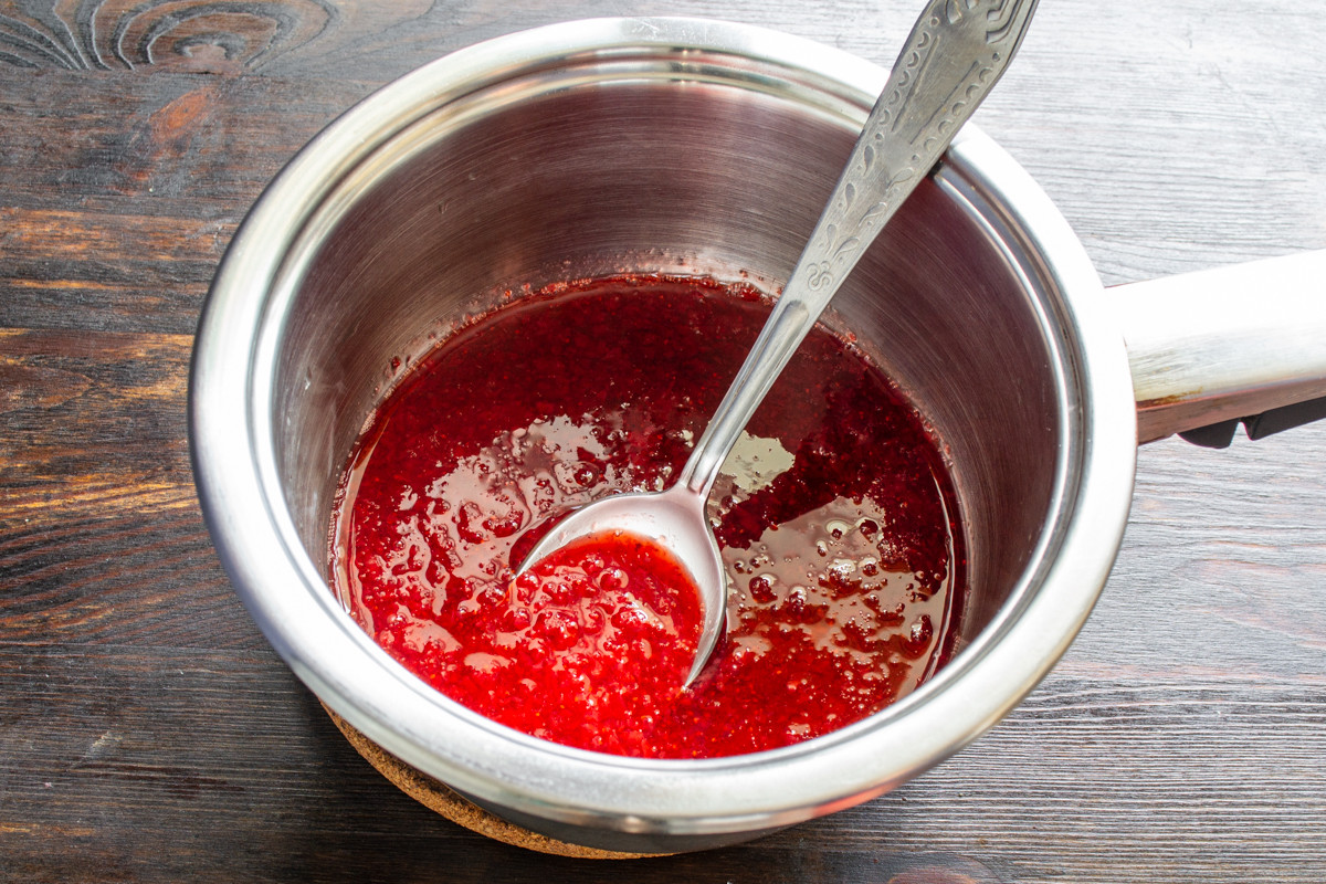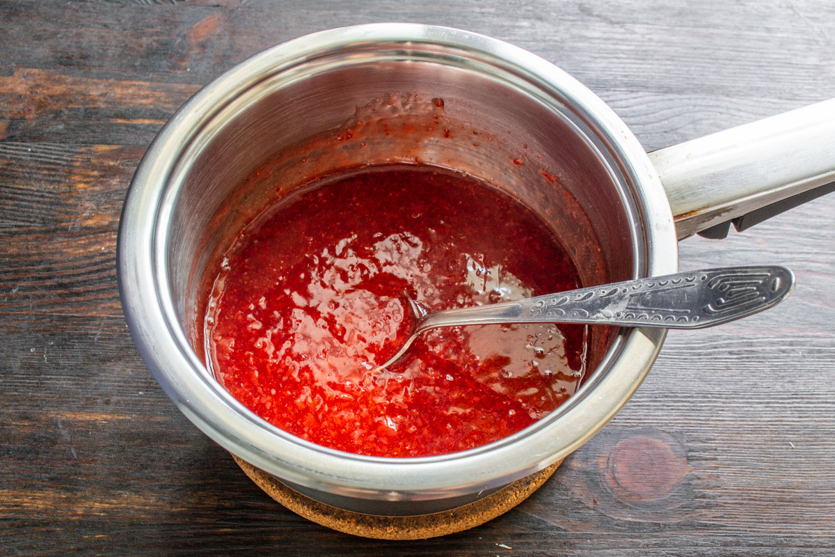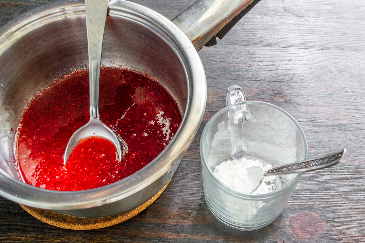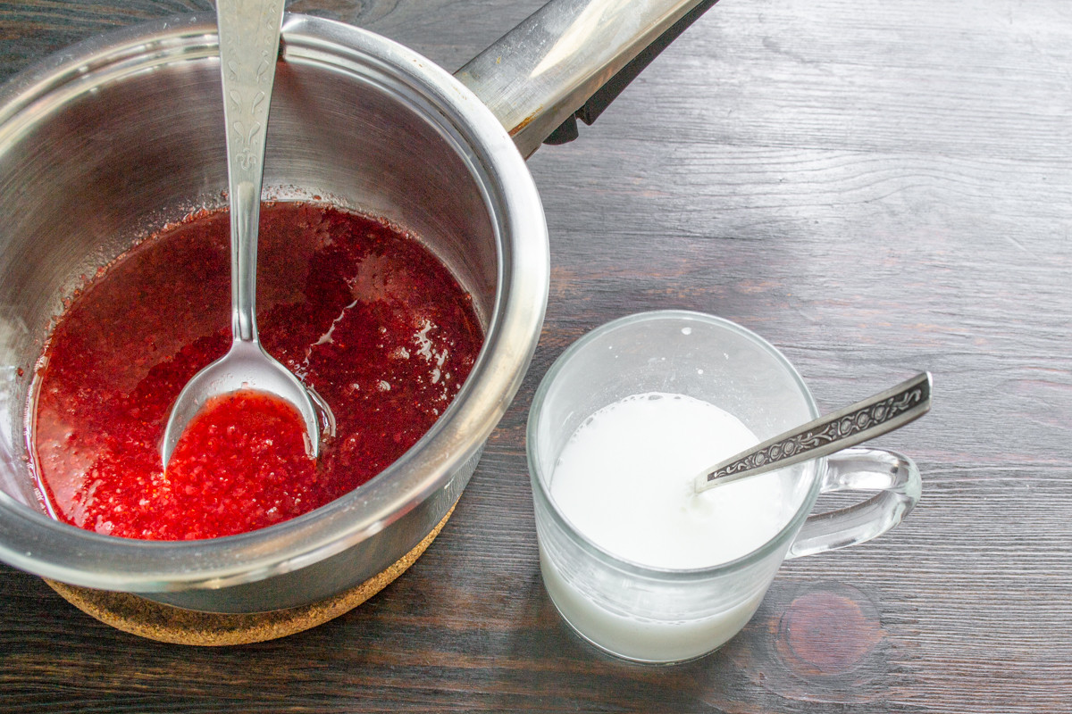 Первым делом приготовим кисель из клубники. Свежие или замороженные ягоды смешиваем с сахарным песком. Измельчаем блендером или разминаем картофельной толкушкой и протираем сквозь сито. Клубничное пюре кладем в кастрюлю с толстым дном. Нагреваем до кипения. Кипятим 2 минуты. Количество сахара рассчитайте по своему вкусу, если ягоды сладкие, то сахара нужно чуть-чуть.