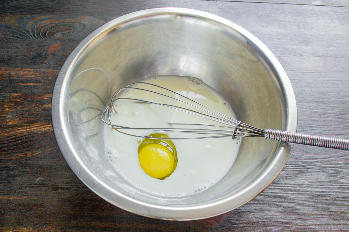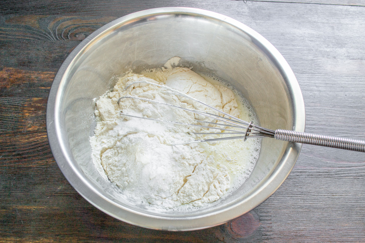 Пшеничную муку смешиваем с питьевой содой и пекарским порошком (разрыхлитель). Насыпаем сухие ингредиенты в миску с жидкими.