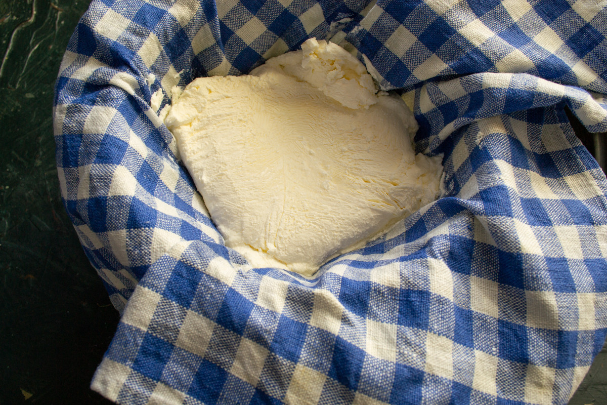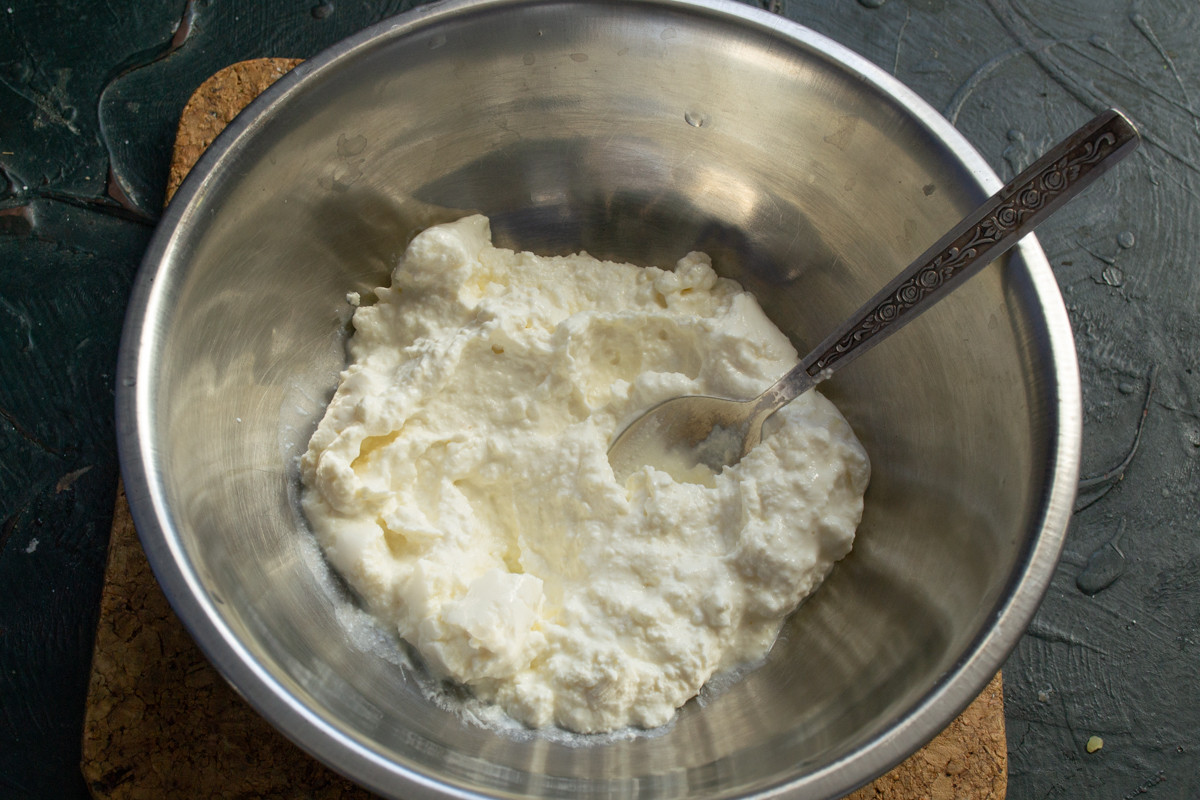 Перекладываем творог в миску, если получился очень сухим добавляем 1 столовую ложку сметаны или майонеза, чтобы размягчить и связать.
