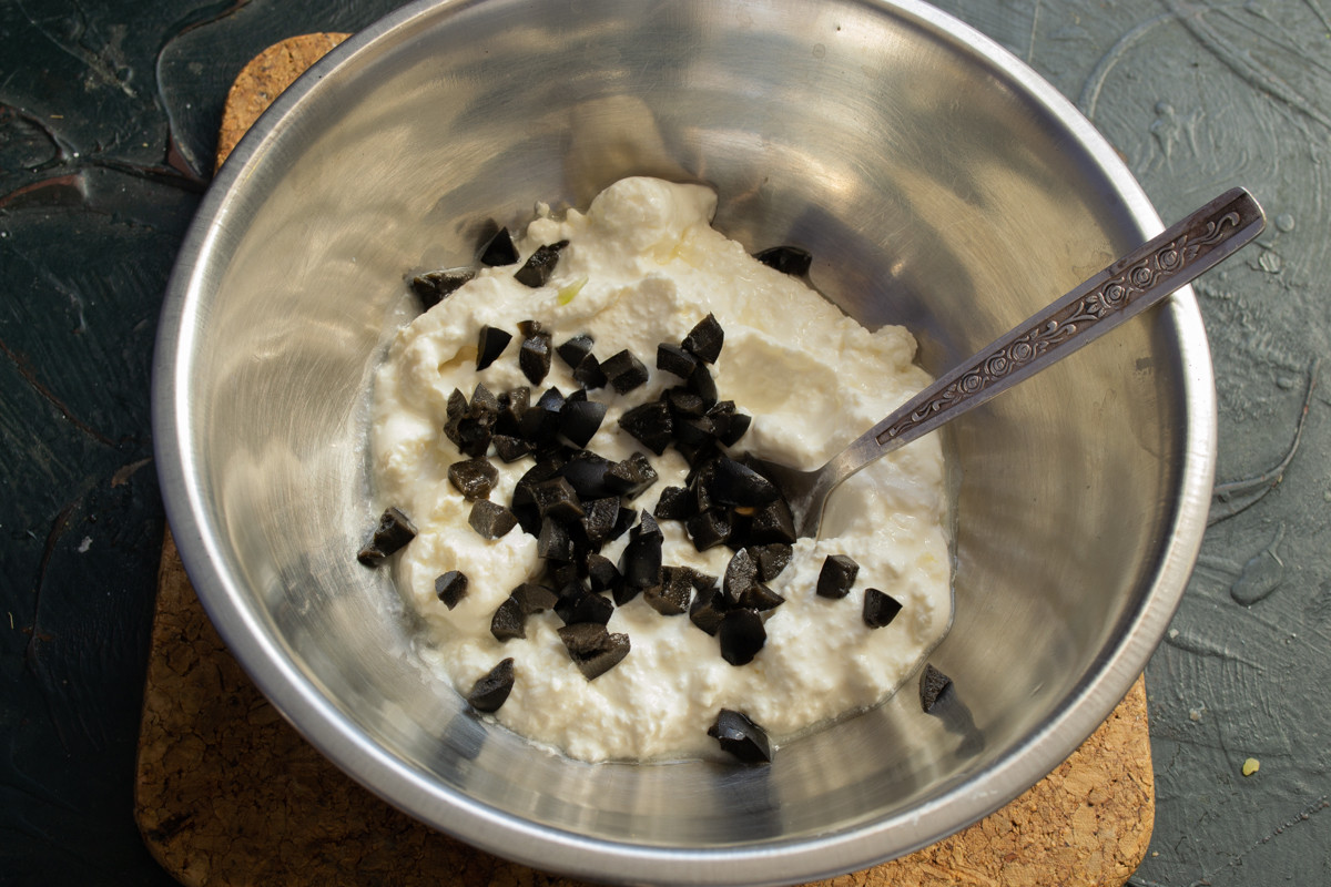 Черные оливки без косточки режем мелко, добавляем к творогу.
