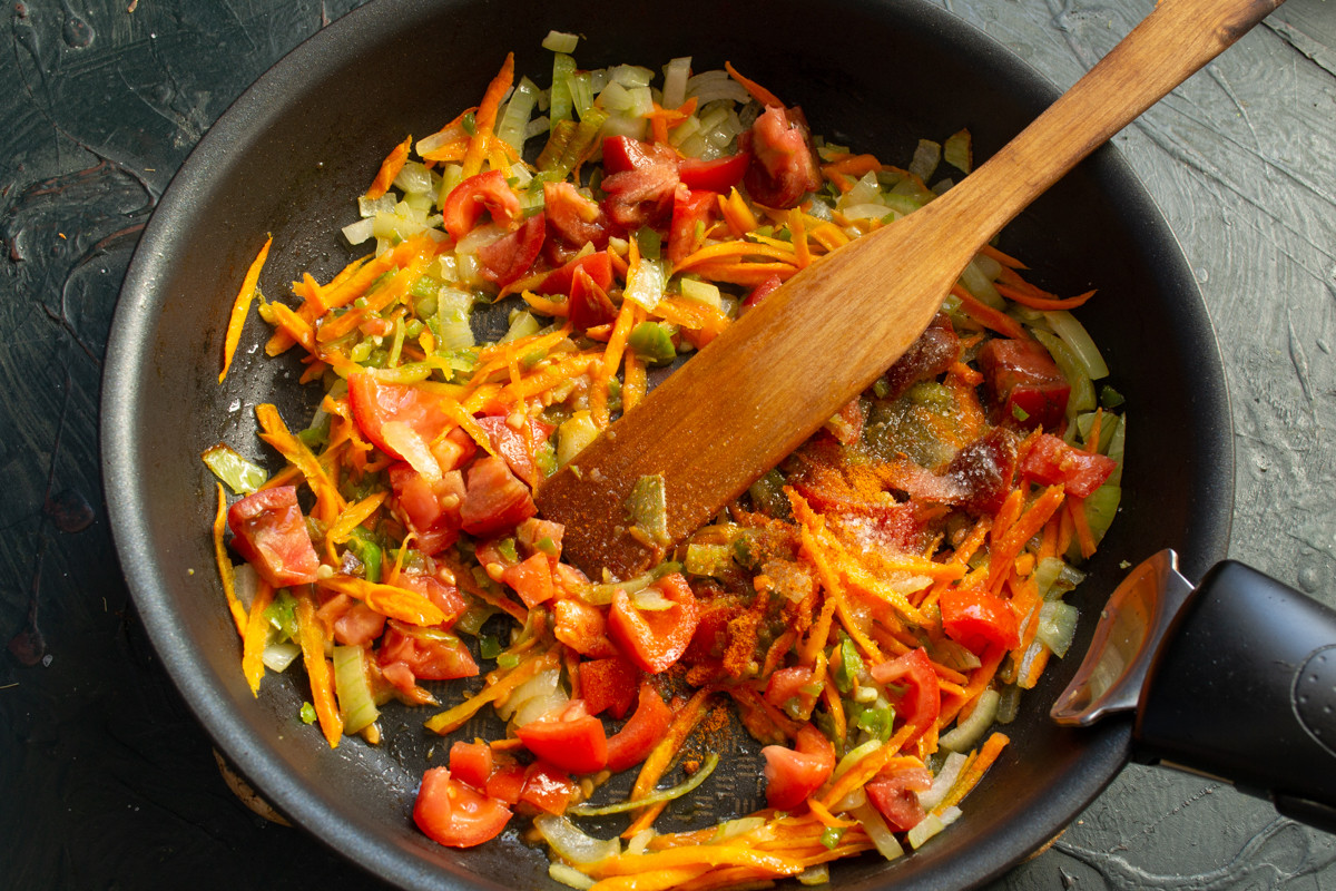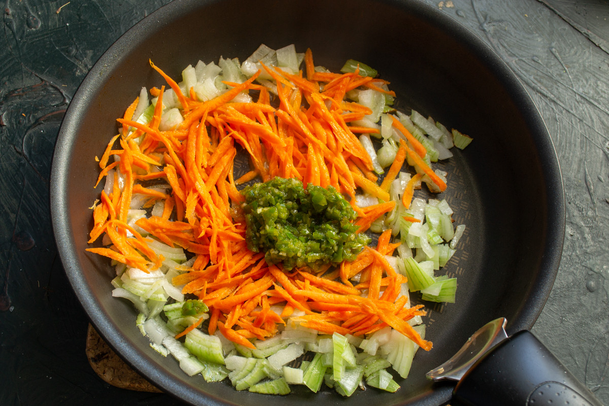 Небольшую головку репчатого лука режем мелко. морковь скоблим, натираем на овощной тёрке. Стручок зелёного чили чистим от семян. Режем чили и чеснок мелко, добавляем щепотку крупной соли, растираем пестиком в кашицу. В сковороде нагреваем 2 столовые ложки нейтрального растительного масла. Кладём овощи в сковороду, добавляем пасту из чеснока и чили, обжариваем 10 минут на небольшом огне.