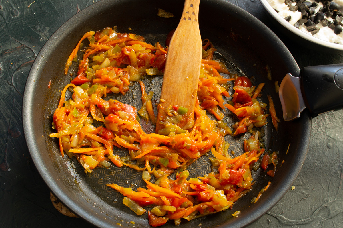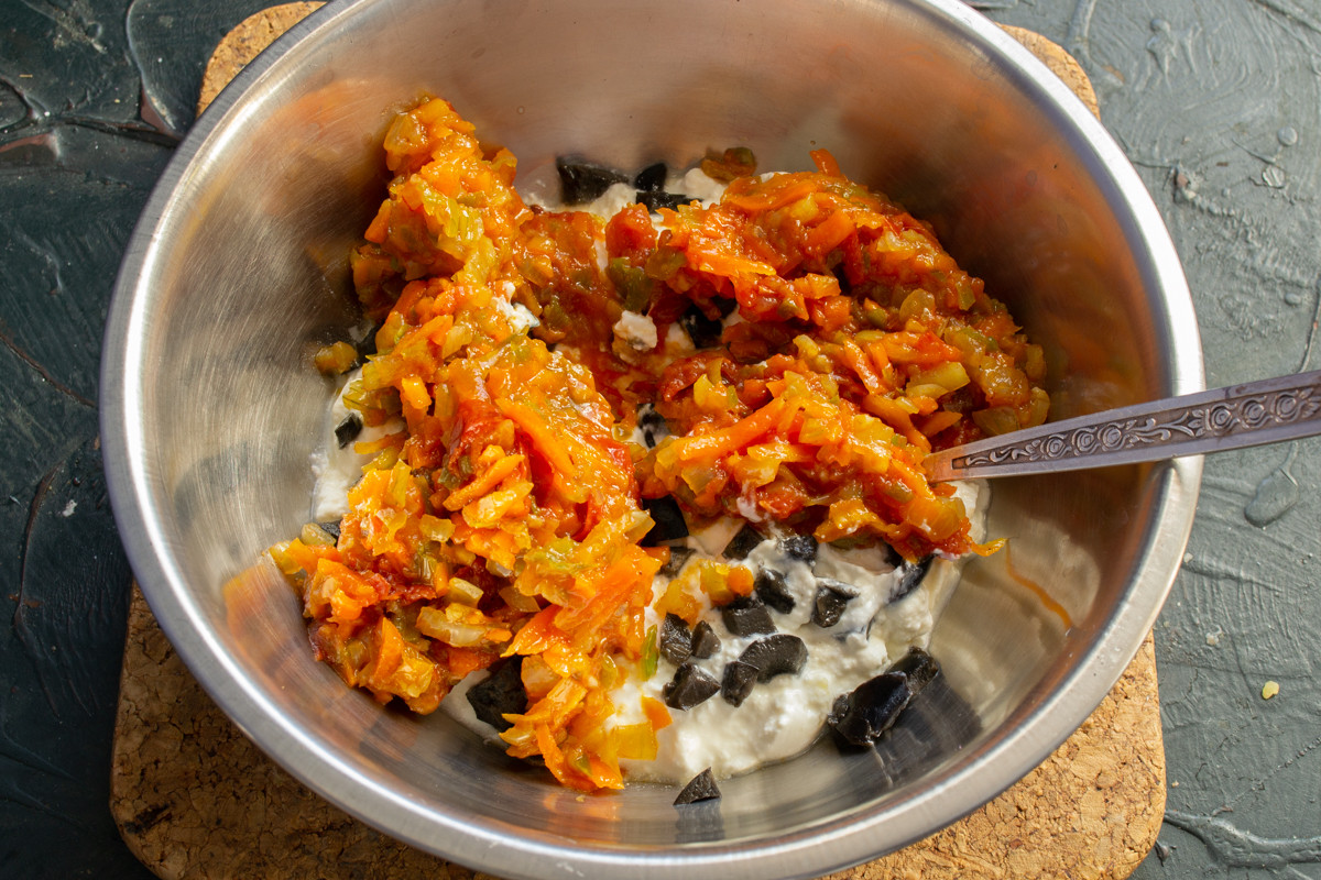 Выкладываем овощи из сковороды на доску, рубим мелко, остужаем до комнатной температуры. Остывшие овощи добавляем к творогу и оливкам.