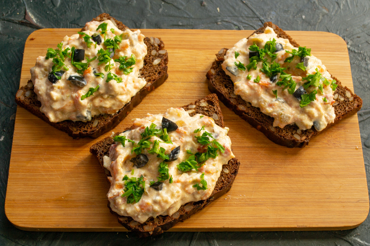 Отрезаем несколько ломтиков вкусного ржаного хлеба с семечками, сверху кладём щедрую порцию овощного паштета с домашним творогом. Украшаем оливками и мелко нарезанной петрушкой.