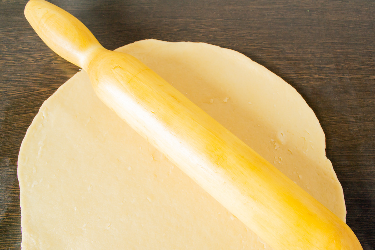 Скалку и рабочий стол смазываем растительным маслом. Раскатываем охлажденное тесто в пласт толщиной 4-5 миллиметров. Размер лепешки должен быть больше диаметра сковородки.