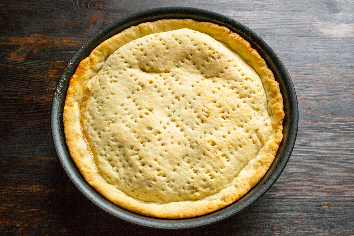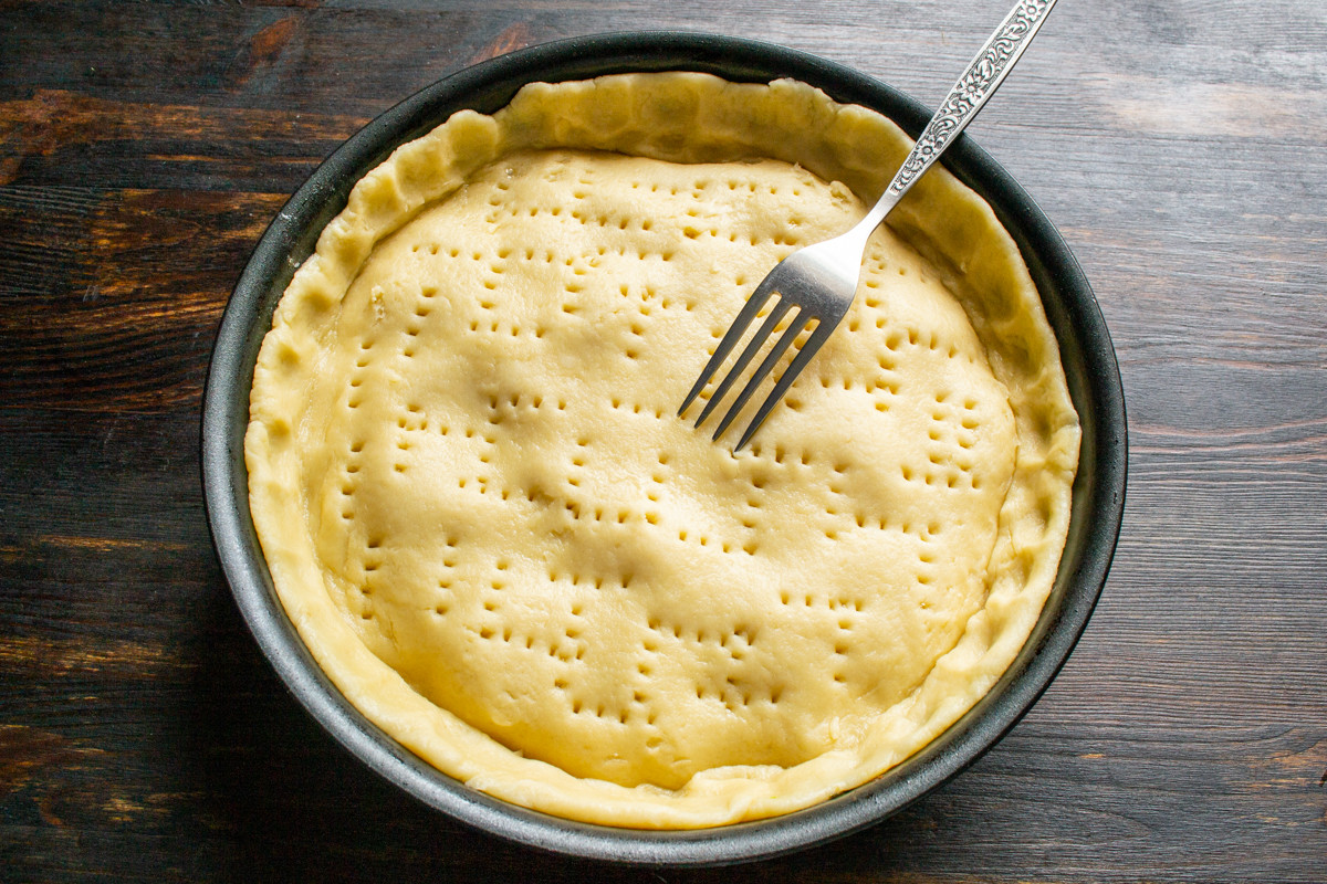 Вилкой протыкаем тесто в нескольких местах, чтобы во время выпечки пар из начинки мог прорываться наружу.