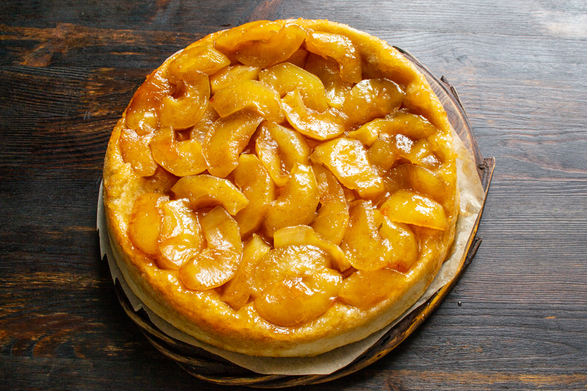 Готовим тарт Татен – перевернутый пирог с яблоками и шоколадным ликером. Тарт Татен – французский яблочный пирог, в котором яблоки сначала поджариваются в карамели, затем накрываются тестом и запекаются. Перед подачей пирог переворачивают наизнанку и подают на стол яблоками сверху.