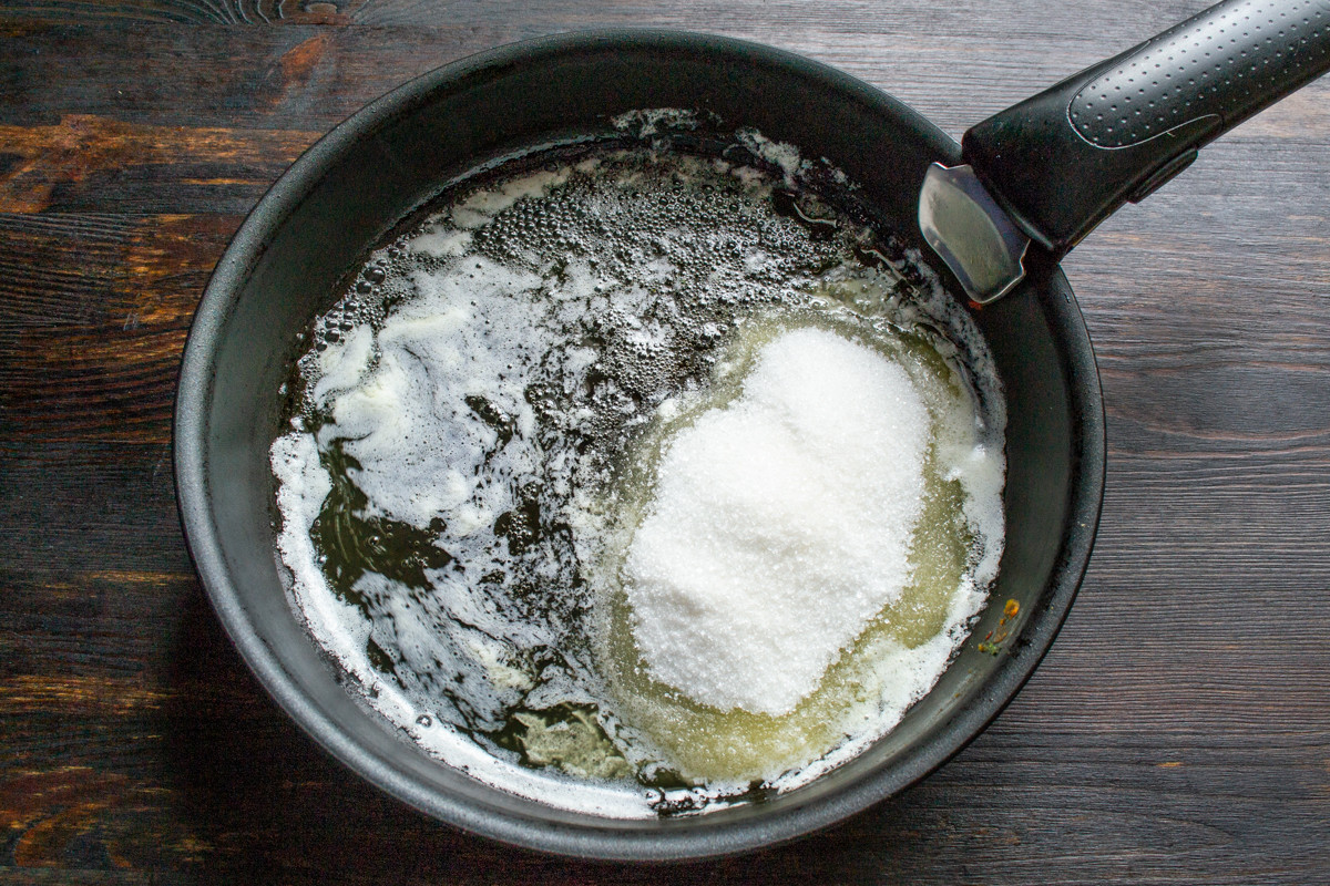 Берем сковороду с толстым дном и антипригарным покрытием. Диаметр сковороды в этом рецепте 25 сантиметров. Пирог готовится в одной посуде. Сначала начинка, затем тесто. Кладем в сковороду сливочное масло, растапливаем, насыпаем сахарный песок. Медленно нагреваем.