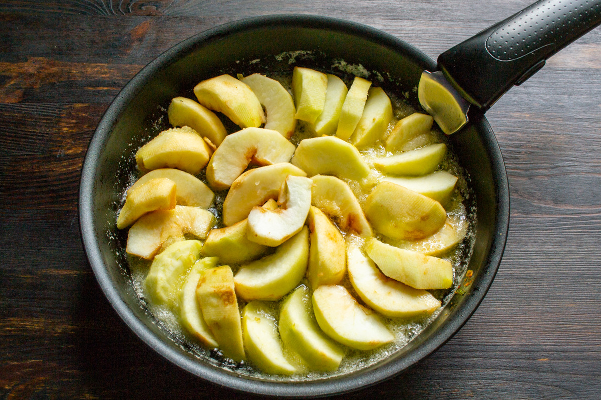 Яблоки чистим от кожуры, вырезаем сердцевину. Нарезаем яблоки ломтиками. Когда сахар почти полностью растает, выкладываем яблоки веером по кругу.