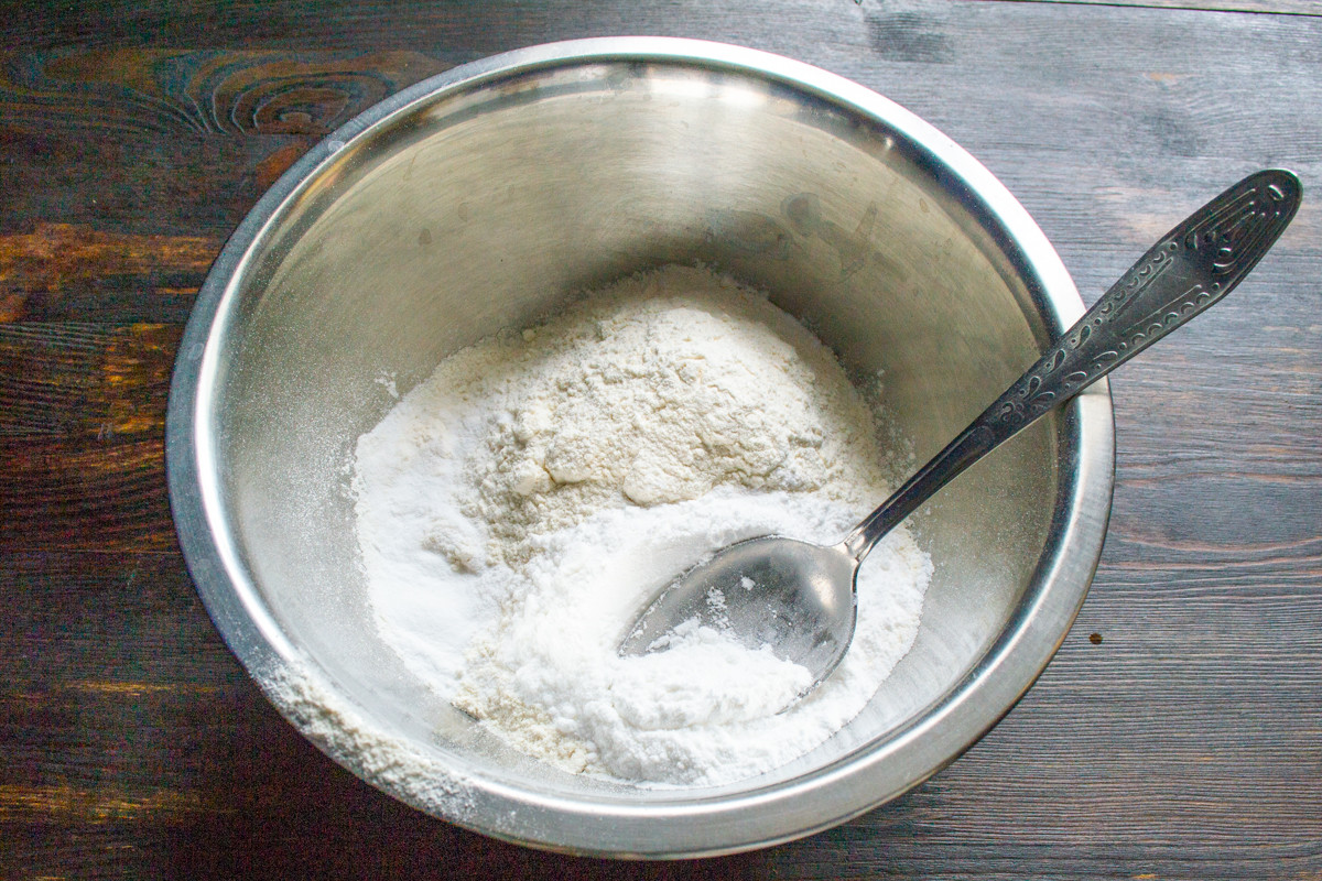Пока яблоки томятся на плите, делаем тесто. Насыпаем в миску пшеничную муку, добавляем сахарную пудру. Если используете ванилин, то добавьте его на этом этапе.