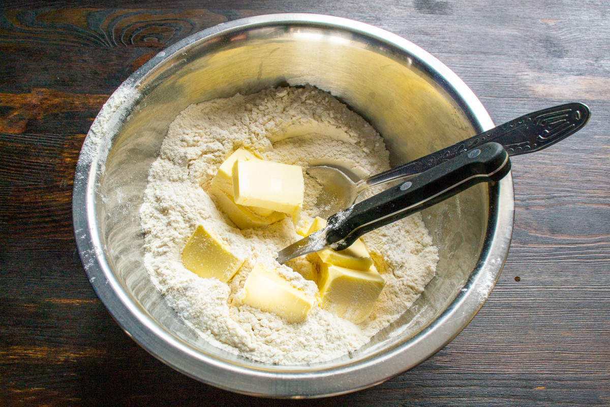 Холодное сливочное масло режем кубиками. Перемешиваем сухие ингредиенты, добавляем к ним сливочное масло.