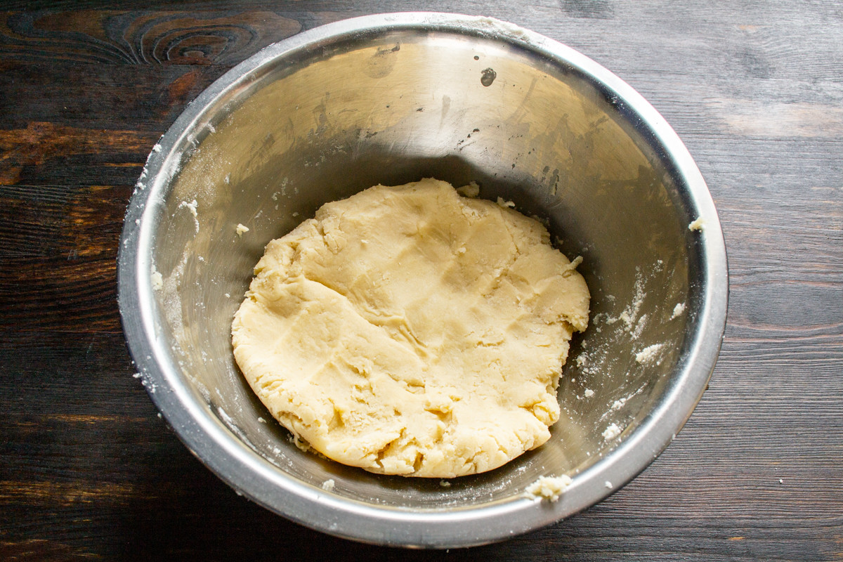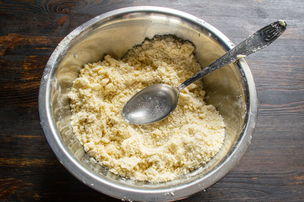 Быстро замешиваем тесто, собираем в комок. Песочное тесто не нужно месить долго, оно становится жестким. Готовое тесто на 30 минут ставим в холодильник, чтобы тесто не подсыхало, прикройте его пищевой пленкой.