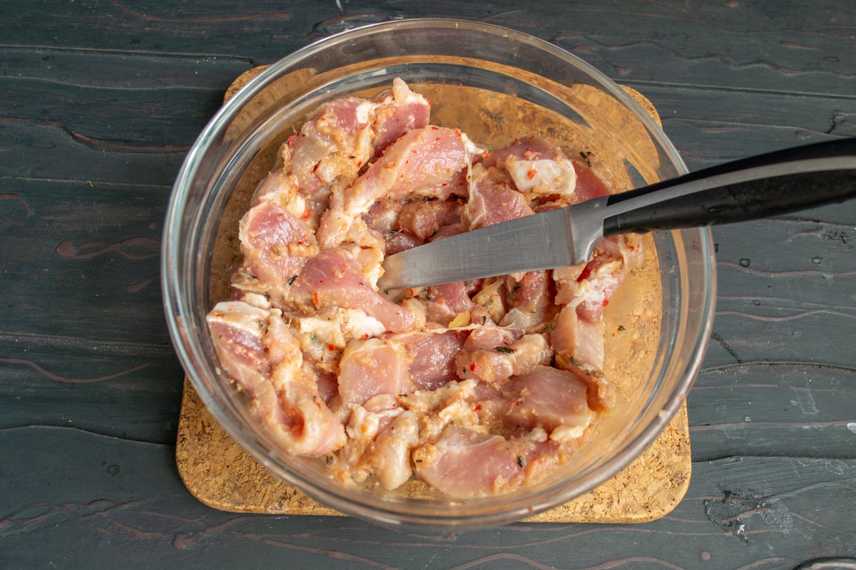 Нежирное мясо нарезаем узкими тонкими ломтиками поперёк волокон. Делаем маринад для свинины с яблоками: в блендере смешиваем до пюреобразного состояния небольшую головку лука, два зубчика чеснока, мёд, оливковое масло и соевый соус, свежевыжатый сок лимона или лайма. По вкусу солим, добавляем стручок жгучего чили и щепотку прованских трав. Смешиваем нарезанное мясо с маринадом, оставляем в холодильнике на час, можно на ночь, будет только вкуснее.