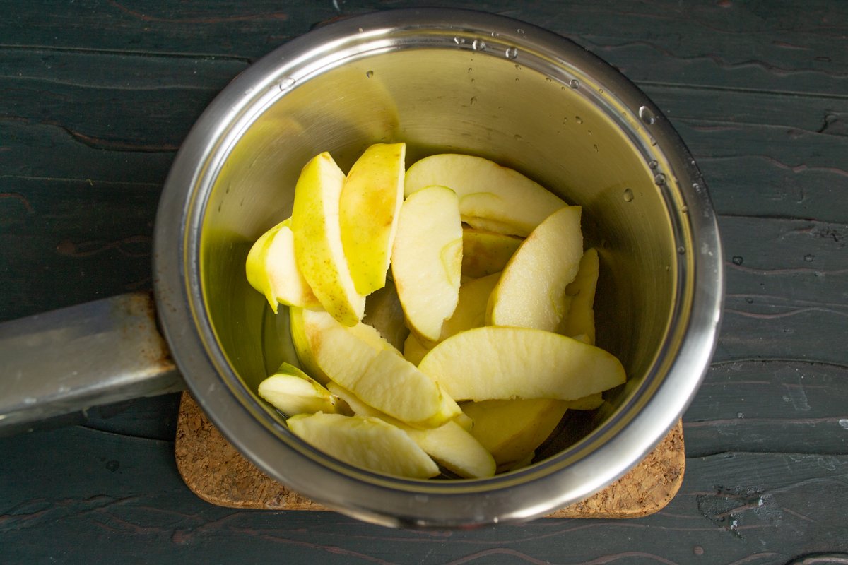 Кисло-сладкие яблоки нарезаем ломтиками вместе с кожурой, сердцевину также можно оставить. Нарезанные яблоки кладём в сотейник с толстым дном.