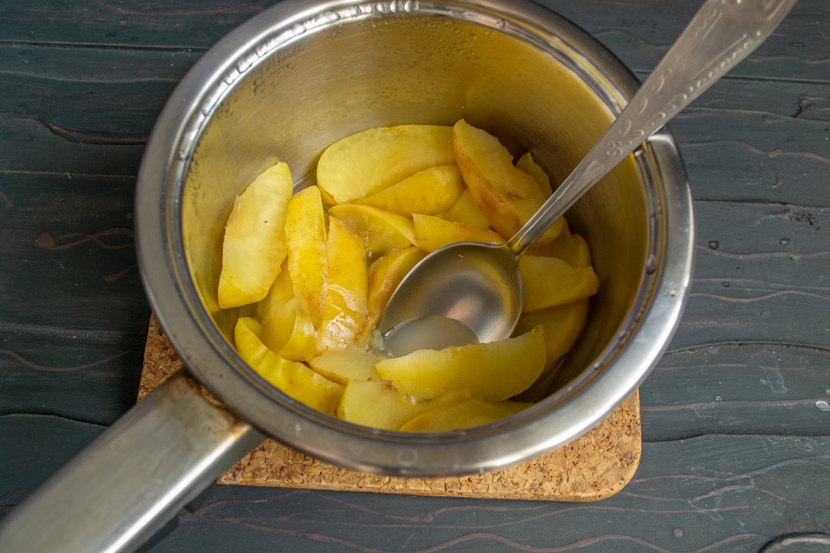 Добавляем 3 столовых ложки горячей воды, закрываем сотейник плотно, распариваем яблоки на маленьком огне 15 минут. В зависимости от сорта фруктов может понадобится чуть больше или чуть меньше времени, важно чтобы яблоки стали совсем мягкими и почти превратились в пюре.