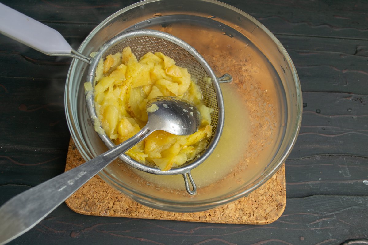 Выкладываем распаренные фрукты на сито, протираем. В миске соберётся густое яблочное пюре, это отличная основа для многих соусов к мясу.