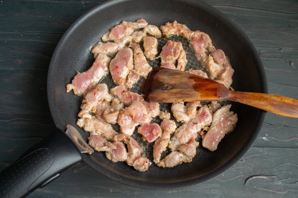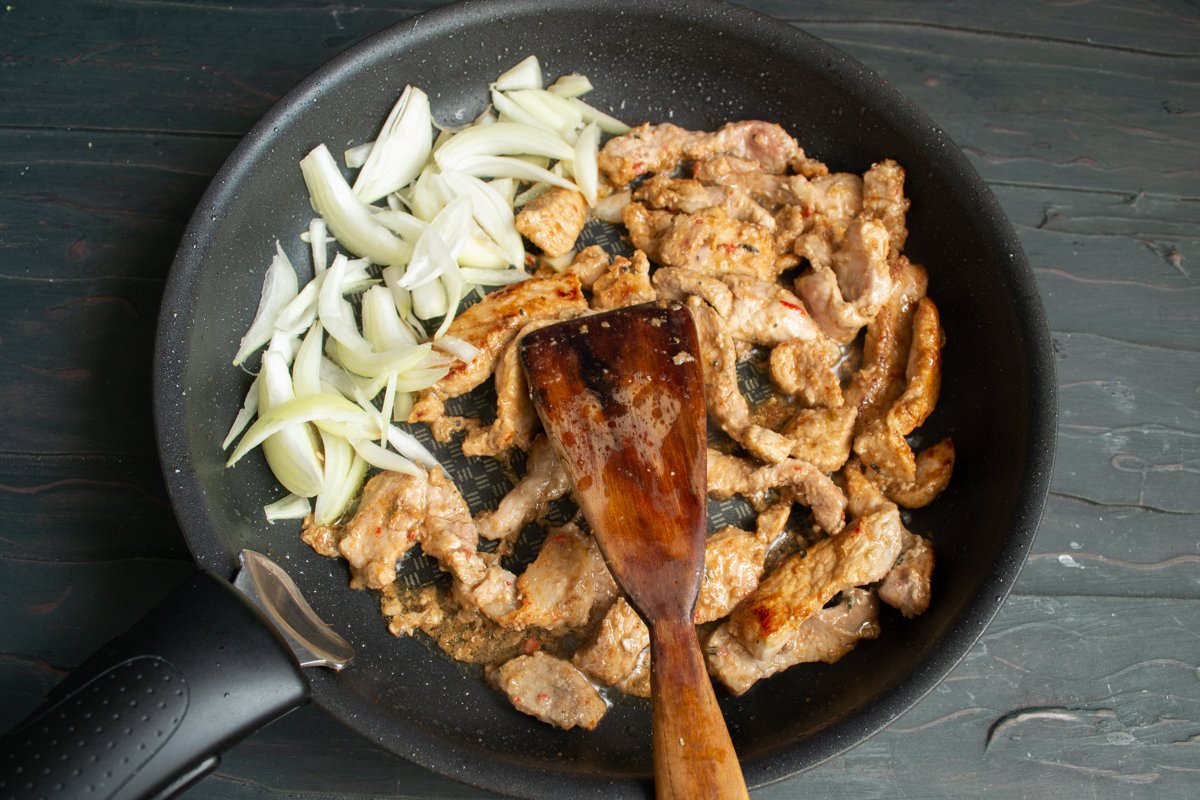 Жарим мясо на сильном огне до золотистой корочки, переворачиваем. Небольшую головку репчатого лука режем толстыми перьями. Сдвигаем мясо в сторону, выкладываем лук, посыпаем щепоткой соли, обжариваем до полупрозрачного состояния, перемешиваем с мясом.