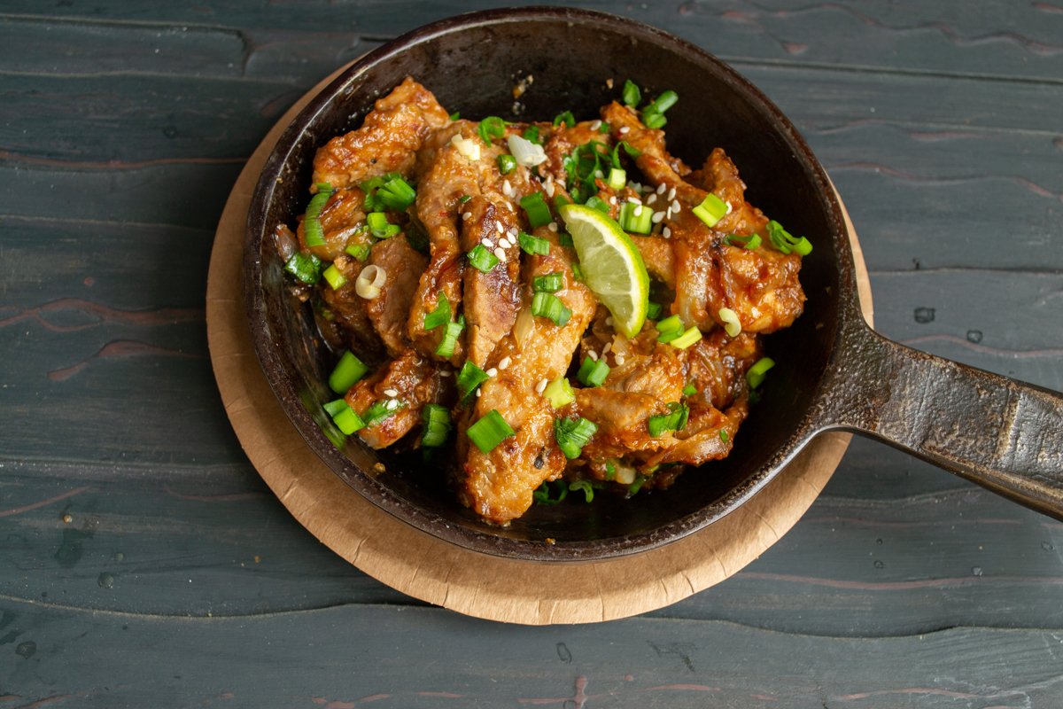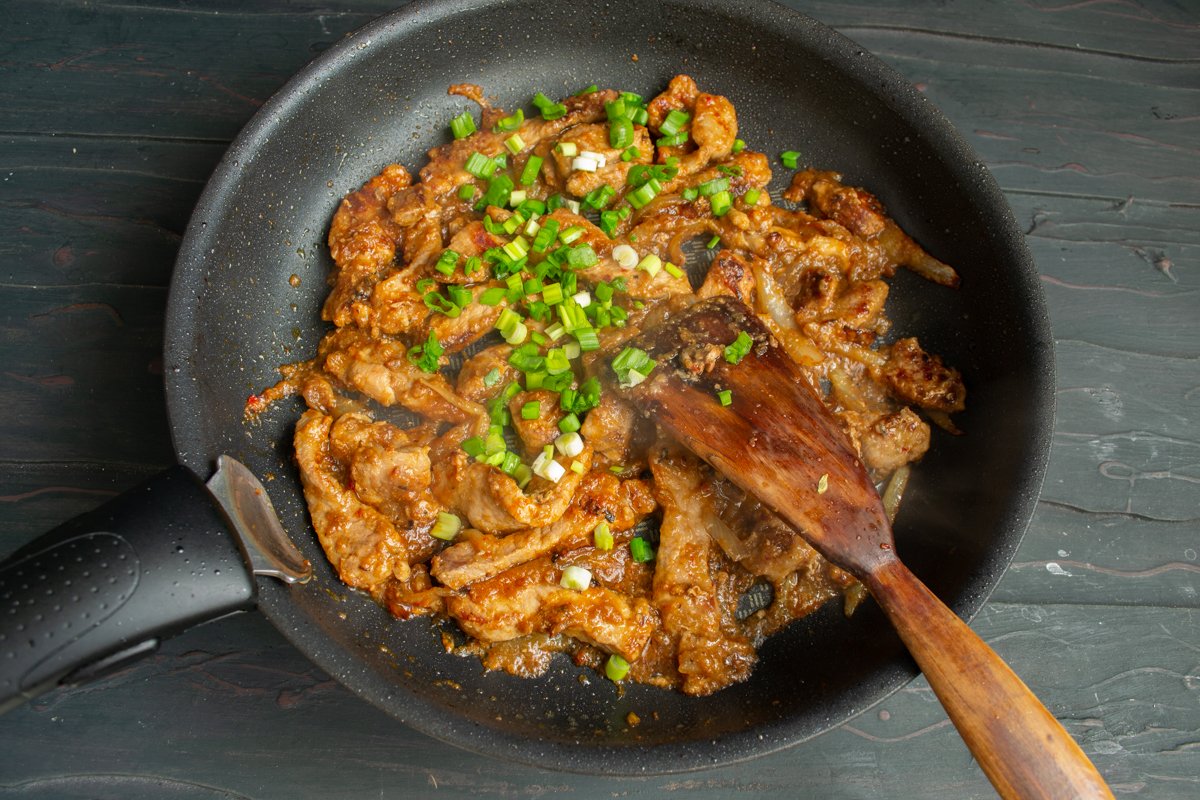 За пару минут до готовности добавляем небольшой пучок мелко порезанного зелёного лука, прогреваем свинину с зелёным луком и снимаем сковородку с огня.