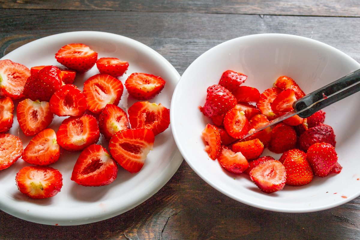 Подготовим клубнику. Понадобятся целые красивые ягоды для украшения, а остальная клубника может быть перезревшей и даже чуть мятой. 10-12 крупных ягод разрезаем пополам. Оставшуюся клубнику чистим, нарезаем мелко.