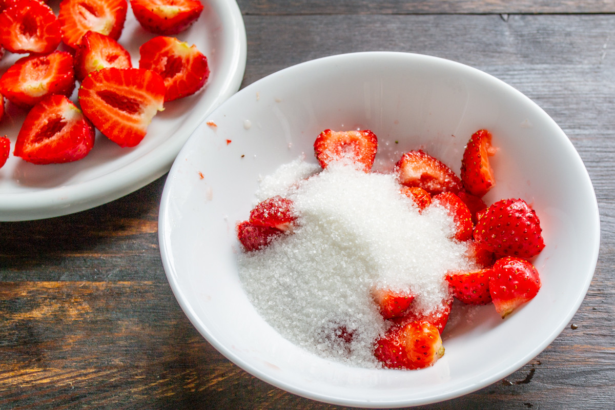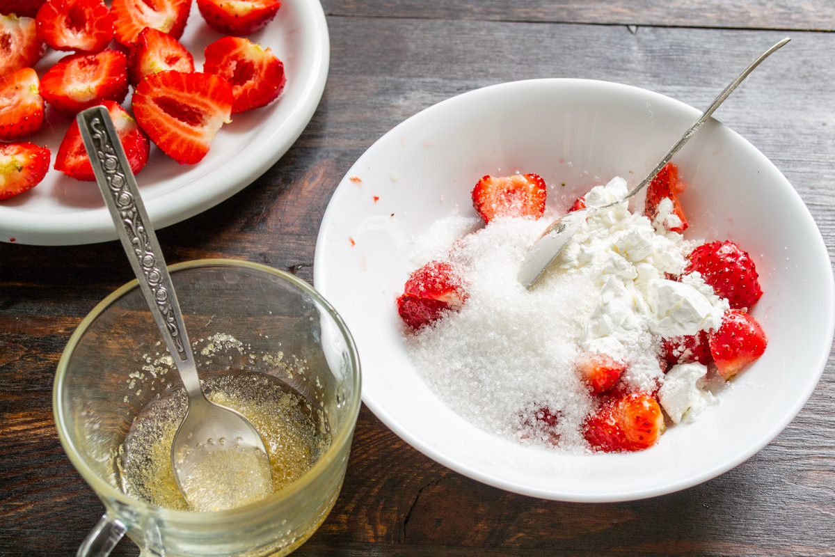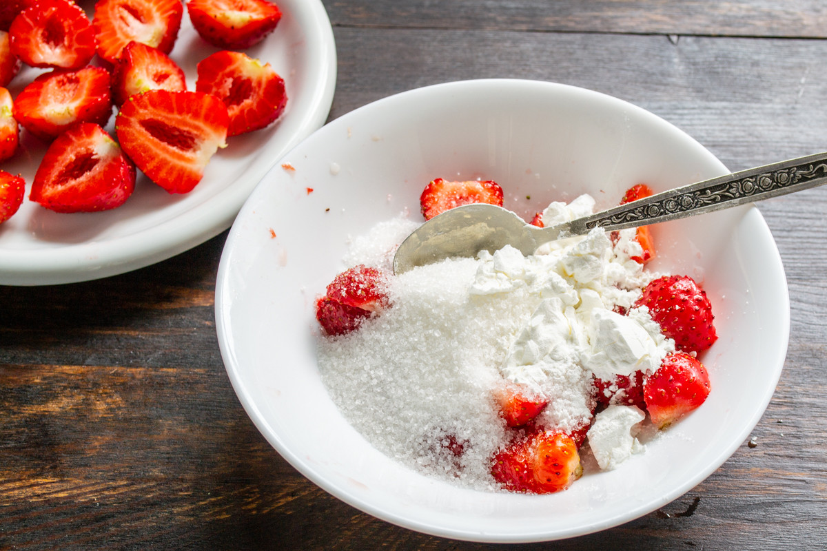 К нарезанной клубнике добавляем сахарный песок. Решайте сами сколько добавить сахара. Можно заменить сахар медом или использовать любой другой подсластитель.