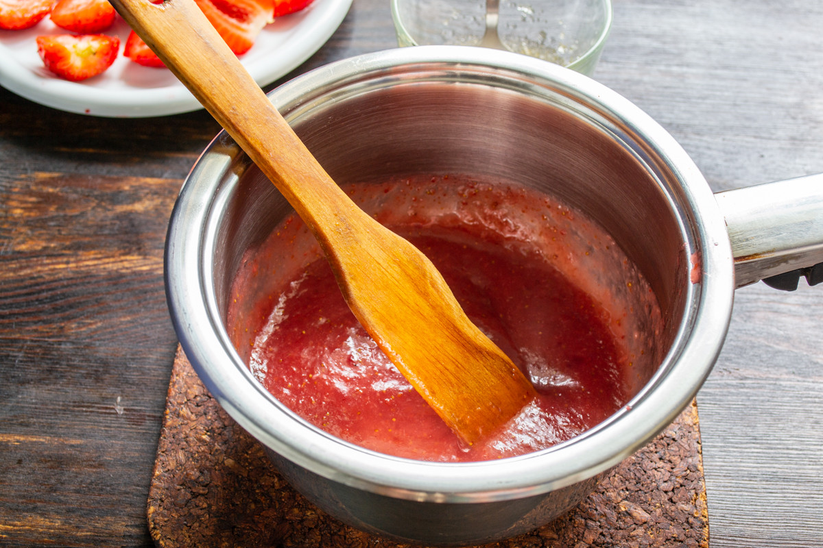 Ягоды с сахаром и крахмалом измельчаем погружным блендером. Переливаем смесь в сотейник. На среднем огне нагреваем смесь до кипения, готовим 1-2 минуты. Снимаем сотейник с огня, добавляем набухший желатин, тщательно перемешиваем. Оставляем заливку в теплом месте, чтобы желатин не застывал.