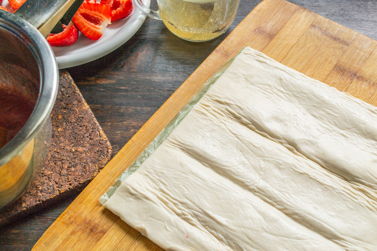 Бездрожжевое слоеное тесто заранее достаем из морозильной камеры. Разворачиваем пласт теста, оставляем на 30-60 минут при комнатной температуре.