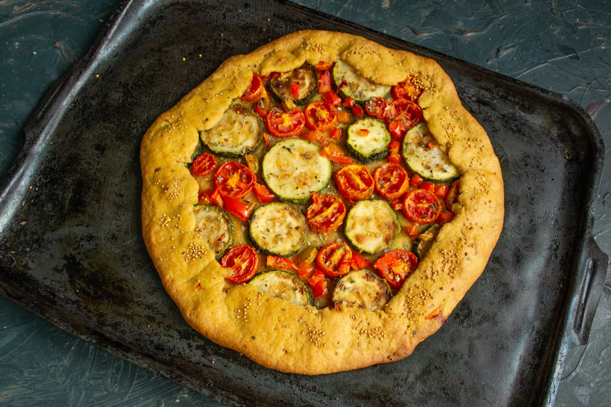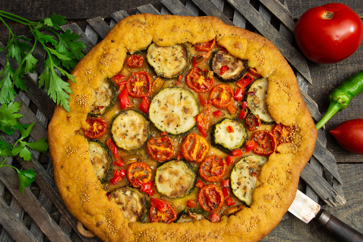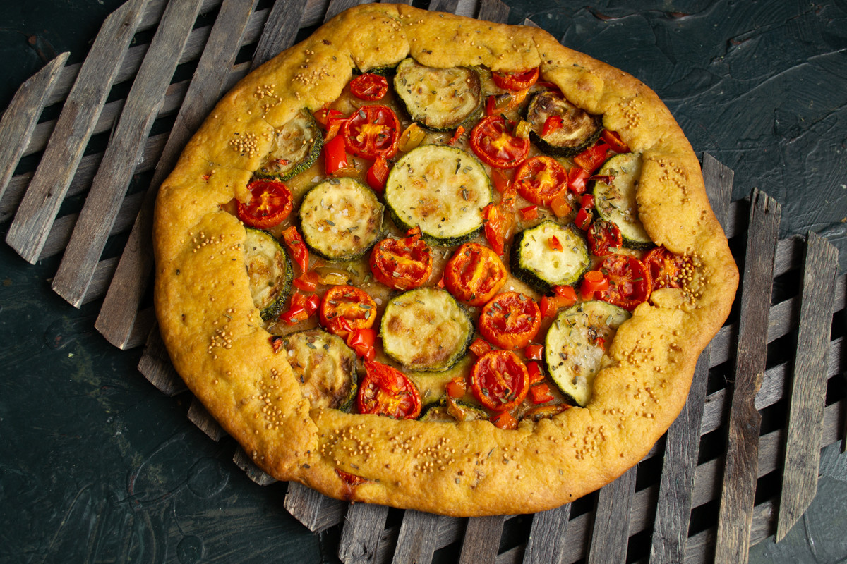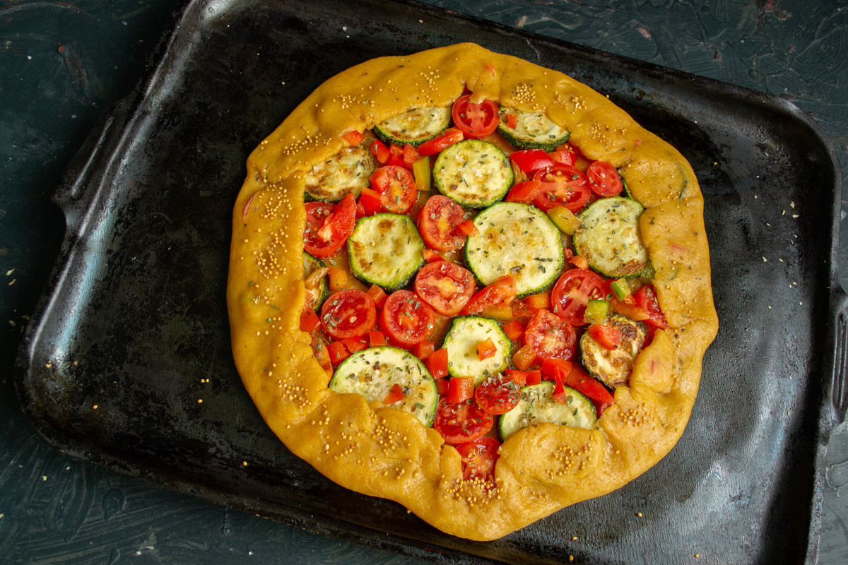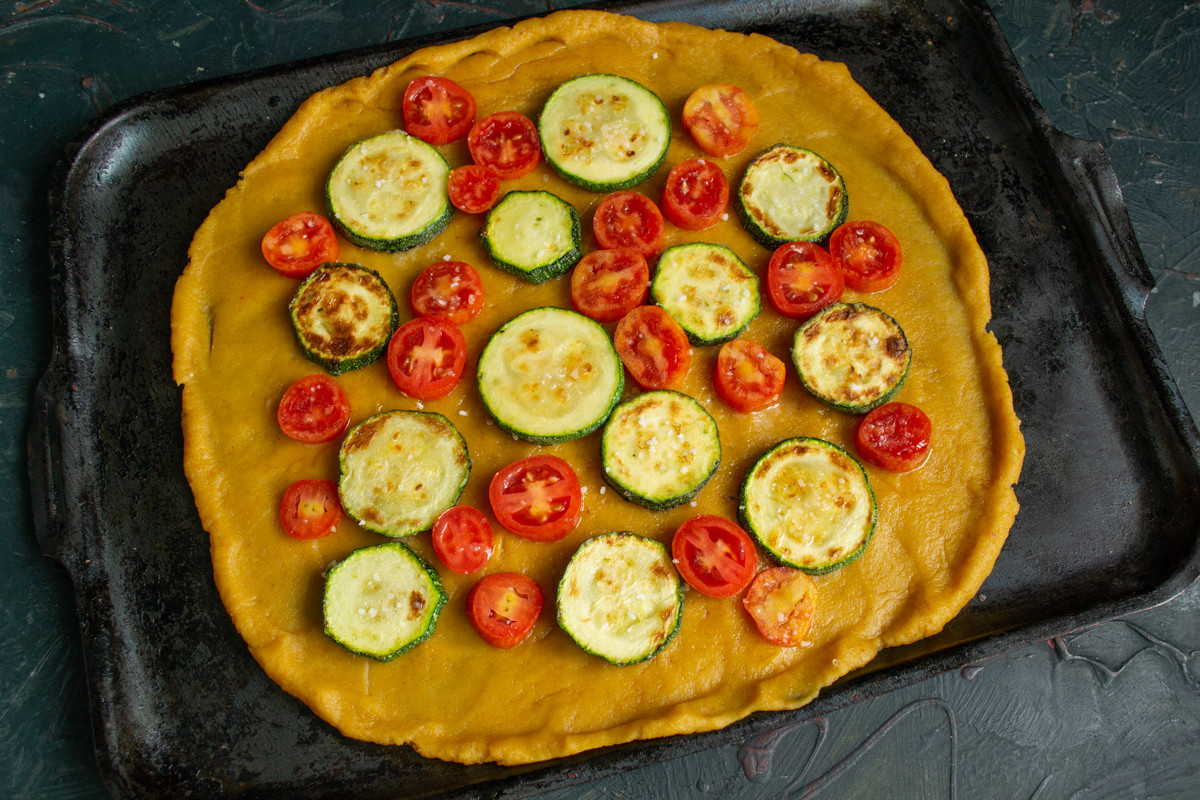 Способ приготовления постного пирога с кабачком, томатами и сладким перцем