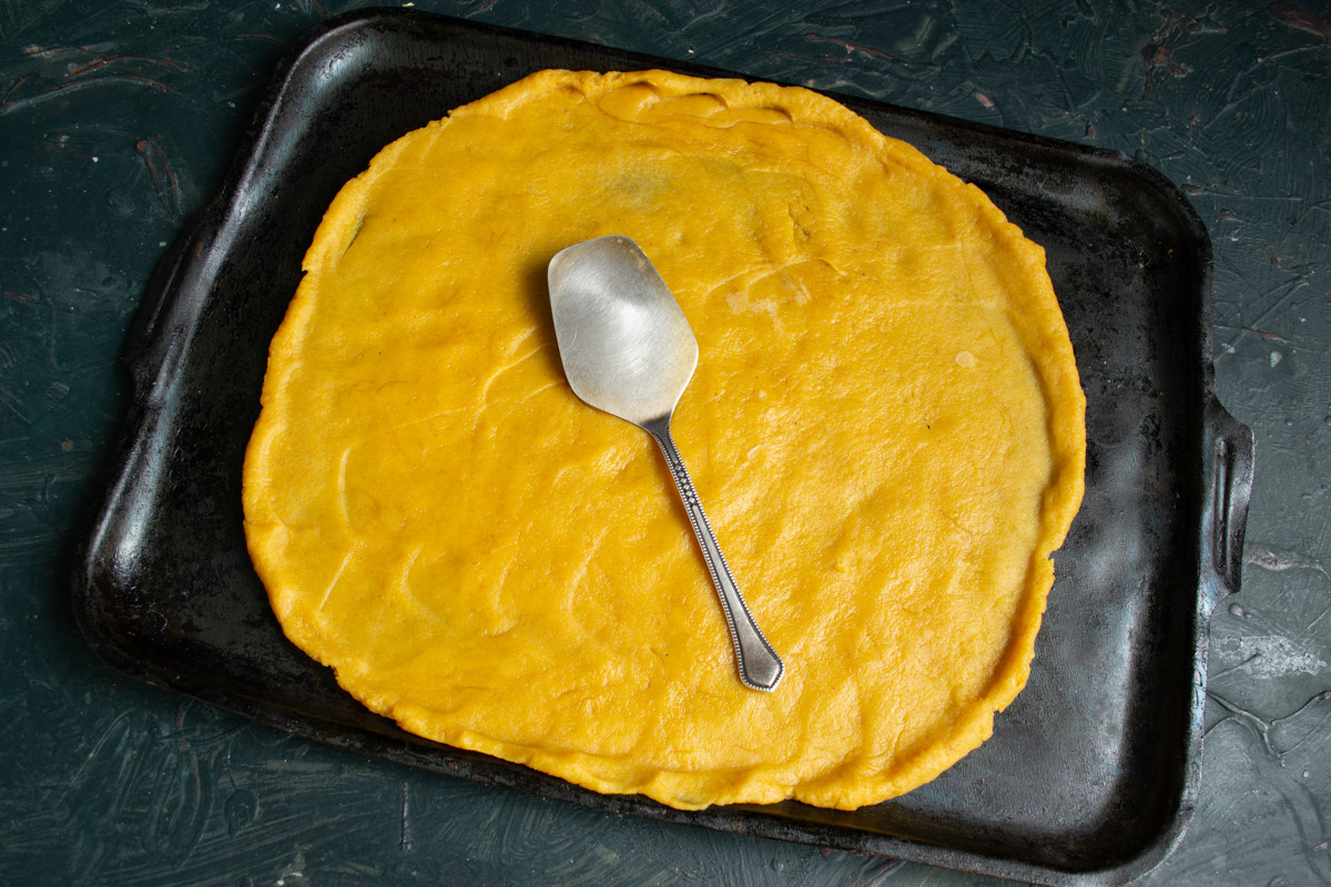 Раскатываем тесто прямо на противне. Тесто очень мягкое, поэтому можно и без скалки обойтись – просто размять его руками в тонкую лепешку и подравнять поверхность лопаткой.