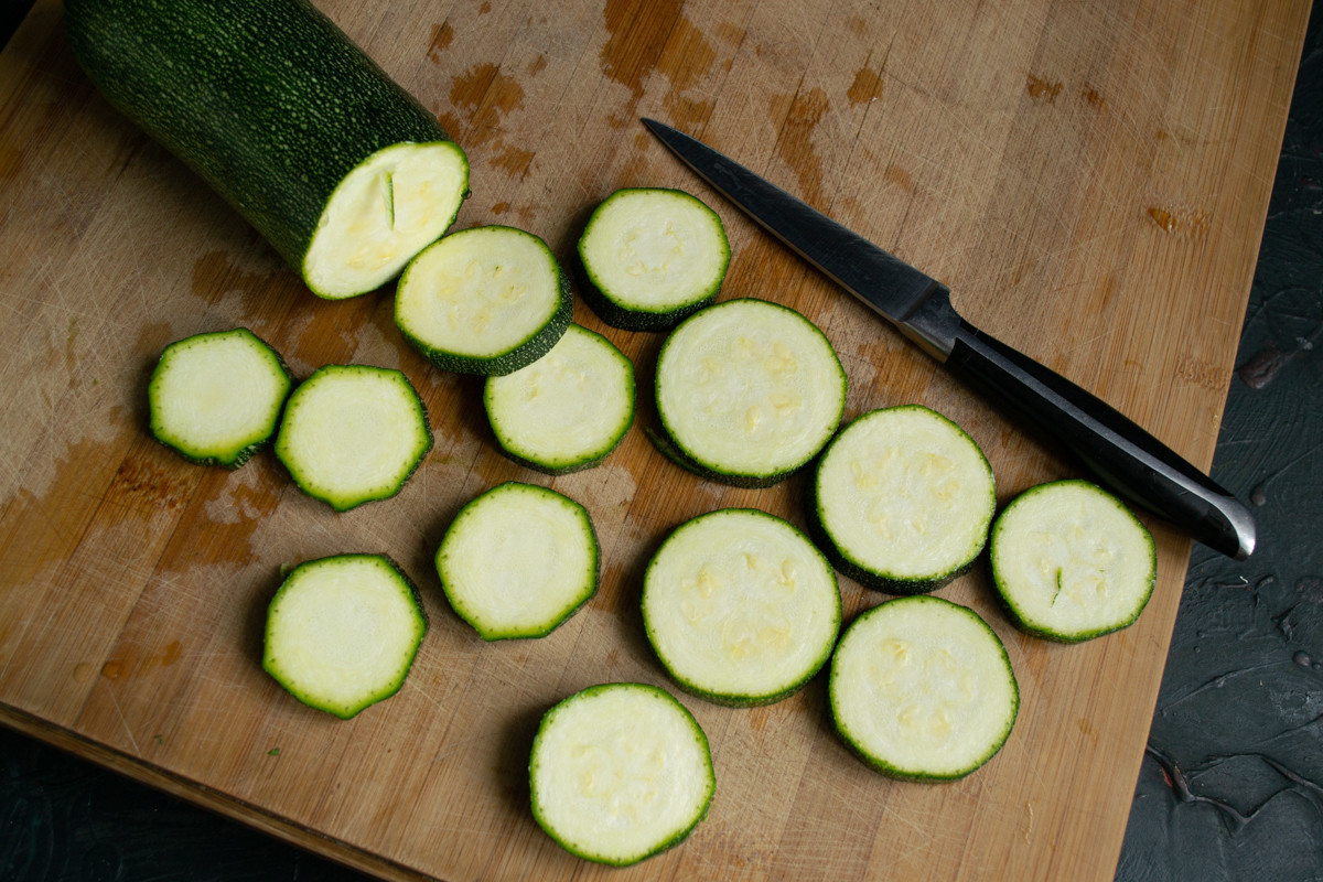 Молодой кабачок нарезаем кружочками толщиной чуть меньше сантиметра. В этом рецепте молодые кабачки с нежной кожицей и почти без семечек, такие овощи чистить не нужно.