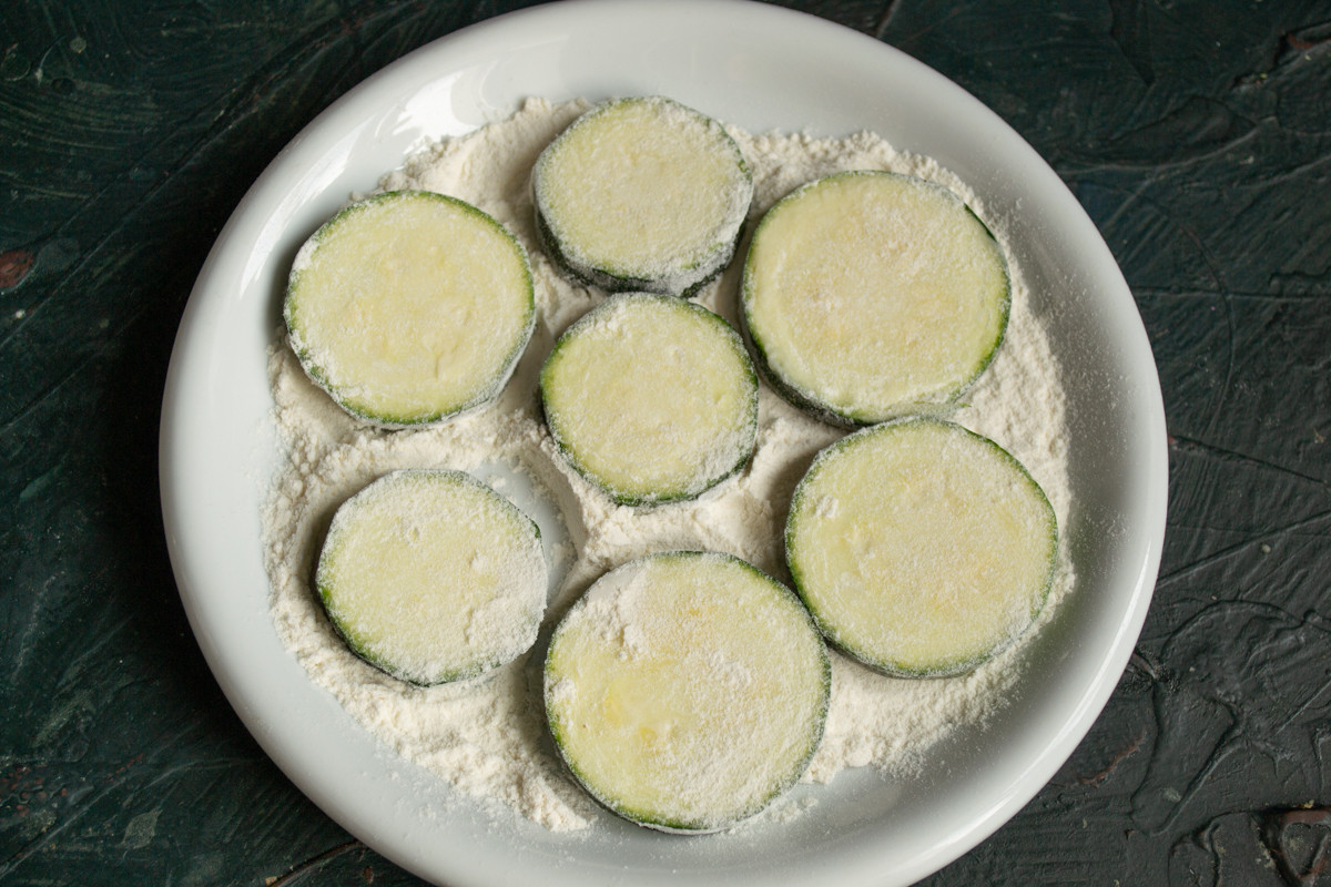 Панируем ломтики кабачка в пшеничной муке. Солить на этом этапе не нужно, чтобы соль не вытягивала влагу в процессе обжарки.