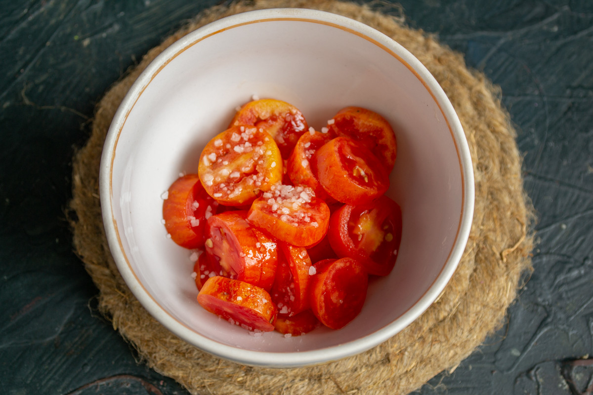 Помидоры нарезаем толстыми кружочками, посыпаем солью, поливаем растительным или оливковым маслом.