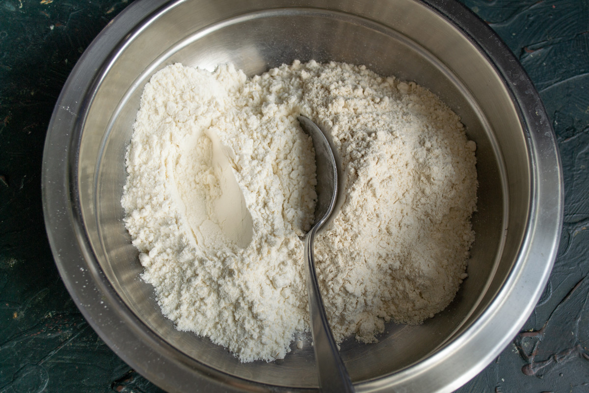 Делаем тесто: смешиваем цельно зерновую пшеничную муку с пшеничной мукой высшего сорта.
