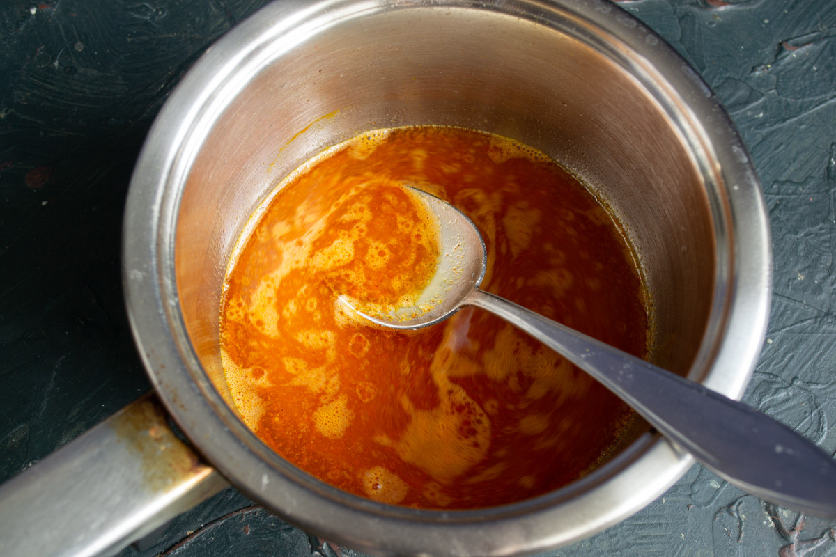 Наливаем в сотейник воды, добавляем томатный кетчуп и растительное масло, насыпаем соль. Нагреваем до кипения. Томатный кетчуп можно заменить густым томатным пюре или пастой.