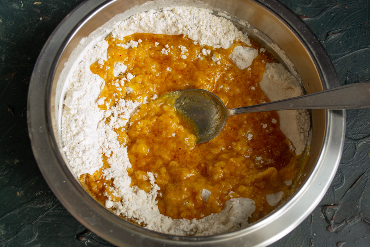 Смешиваем сухие и жидкие ингредиенты. На этом этапе лучше перемешать ложкой, так как можно обжечь ладони.