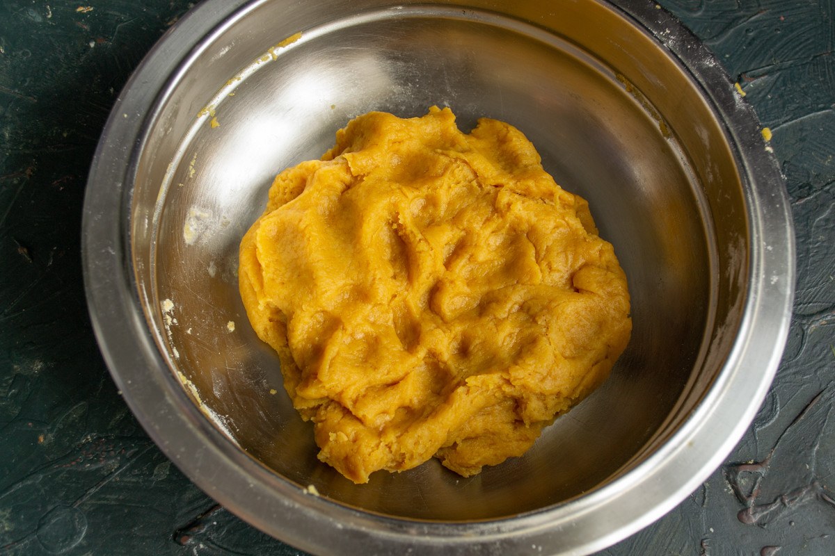Выкладываем тесто на рабочую поверхность. Быстро замешиваем до гладкого состояния.