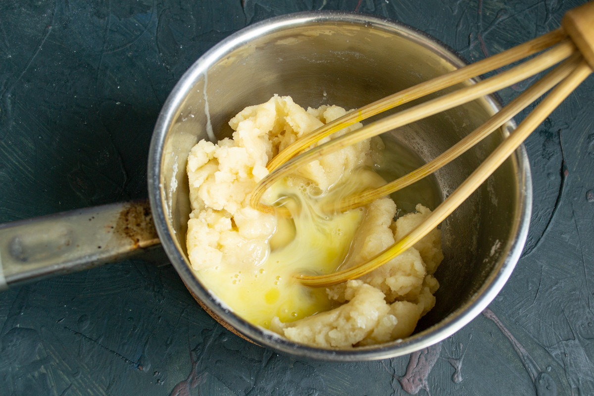 Делаем заварное тесто. Наливаем в небольшую кастрюлю воду, кладём сливочное масло, насыпаем соль, нагреваем до кипения и всыпаем пшеничную муку в\с. Смешиваем до однородности пару минут, остужаем тесто до 80 градусов по Цельсию. По одному добавляем куриные яйца, если яйца крупные, то достаточно двух штук – жидкое тесто растечется по противню.