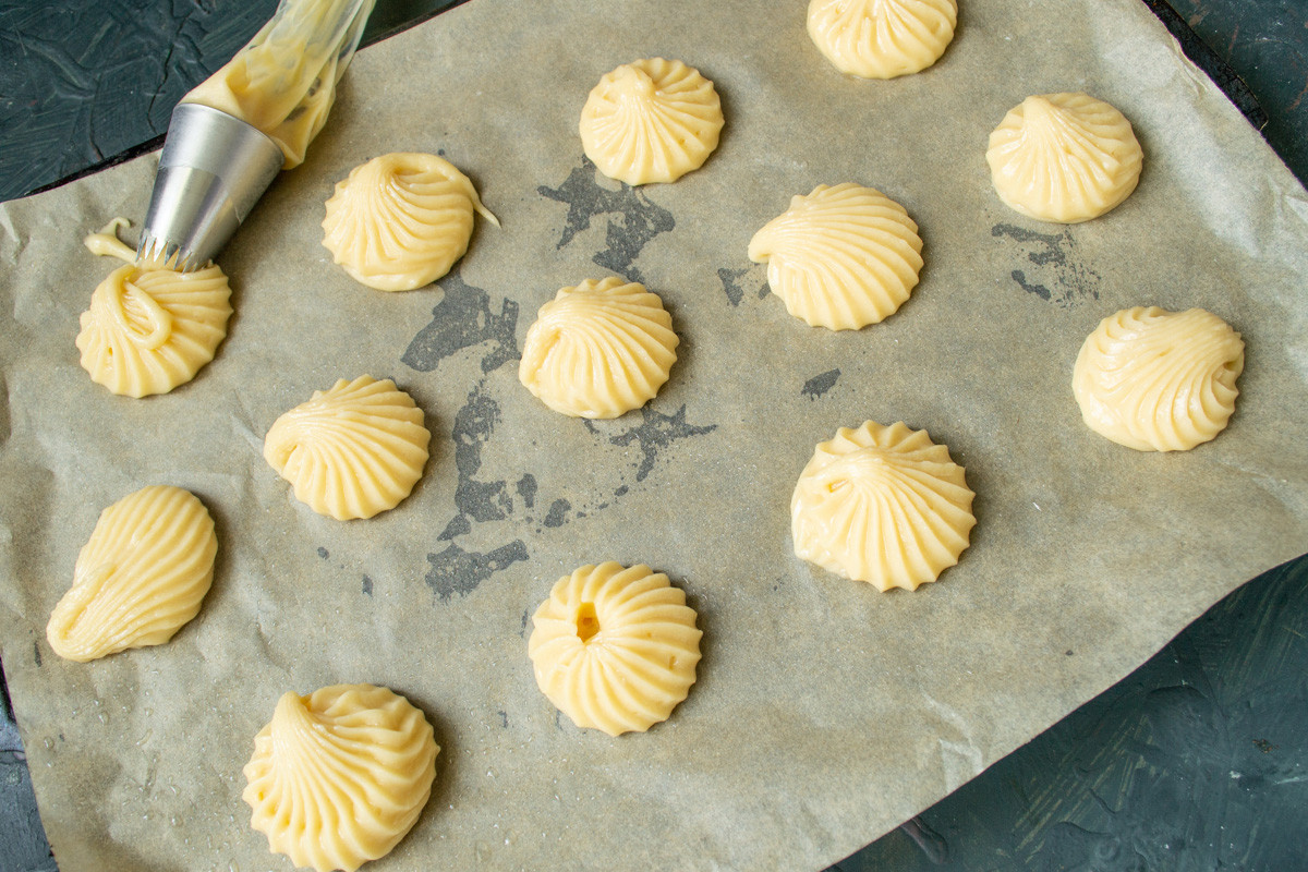 Наполняем тестом кондитерский мешок с насадкой. Смазываем пергамент для выпечки капелькой масла, отсаживаем тесто на пергамент, оставляем между профитролями расстояние, так как в процессе выпечки они сильно увеличатся.