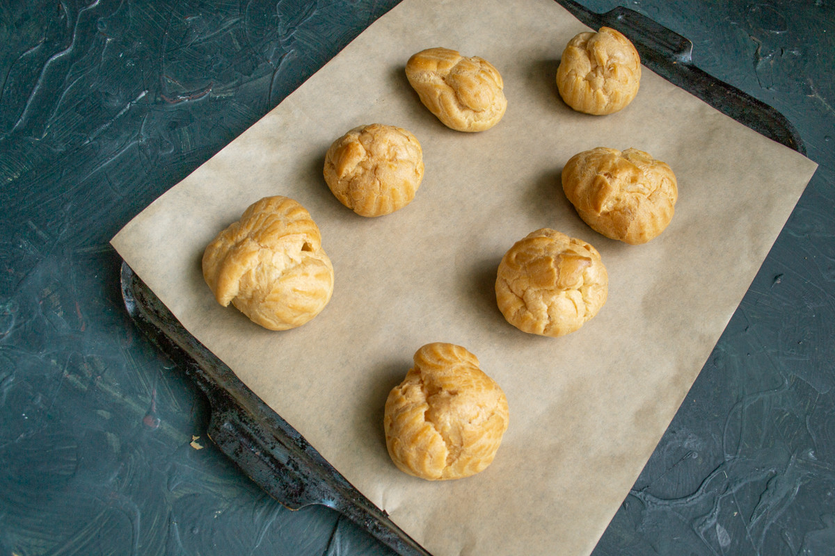 Отправляем противень на нагретый до 200 градусов по Цельсию духовой шкаф, печем 15 минут, затем снижаем температуру до 180 градусов Цельсия и готовим ещё 20 минут. Готовые профитроли остужаем до комнатной температуры.