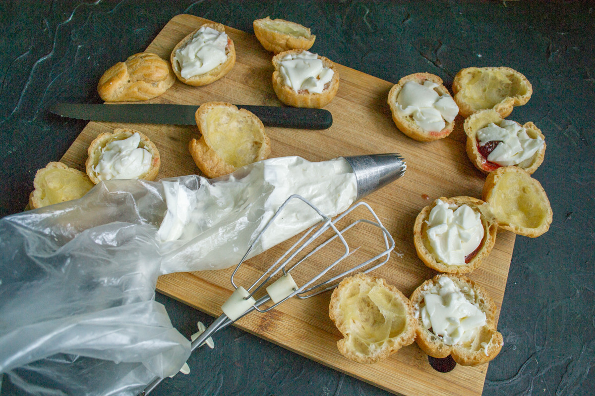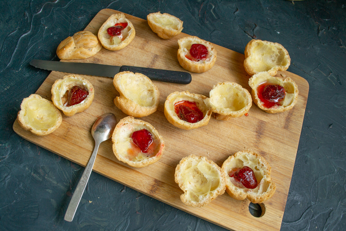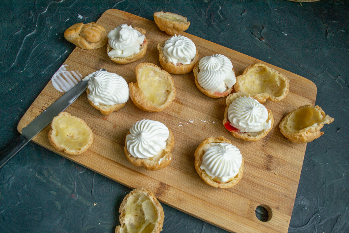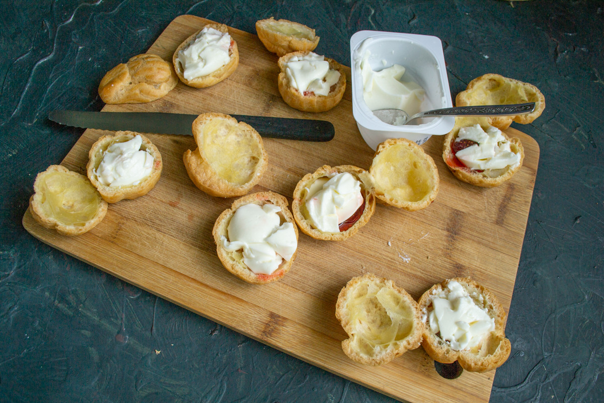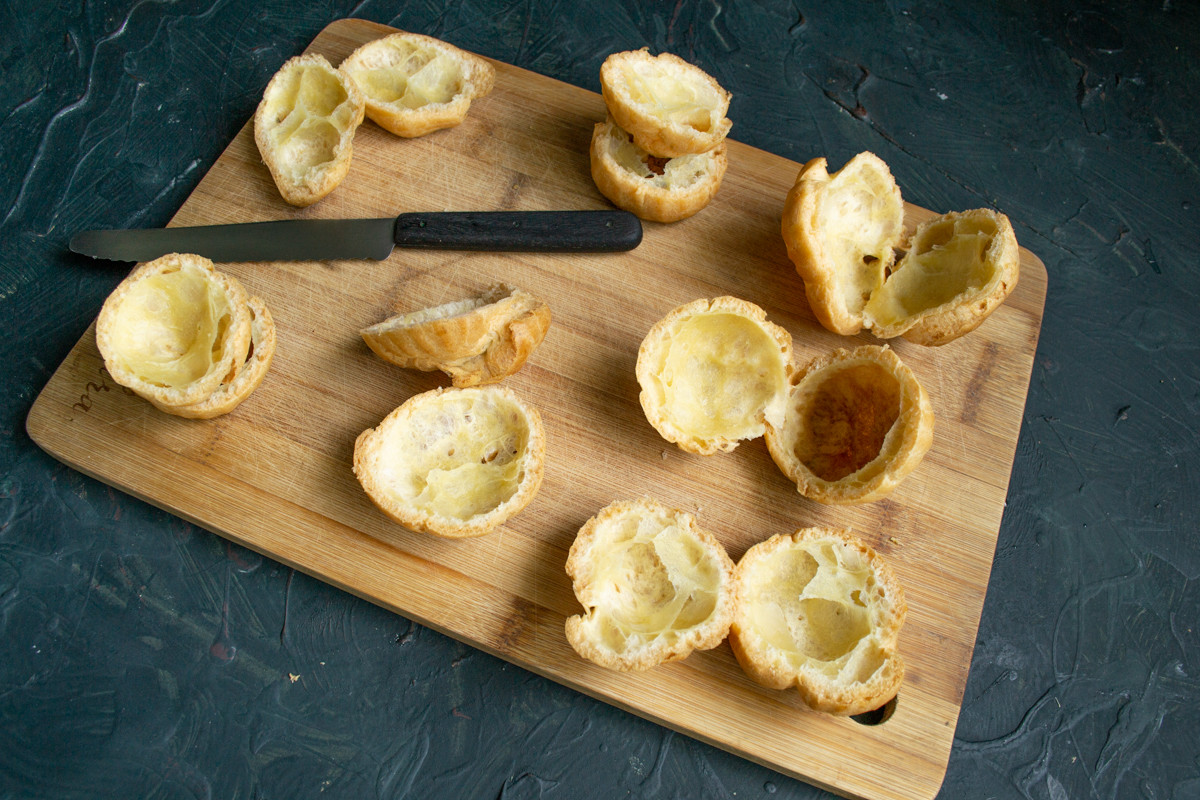 Разрезаем каждое пирожное пополам, если всё сделано правильно, то получаются великолепные ёмкости из теста, которые можно наполнить чем угодно.