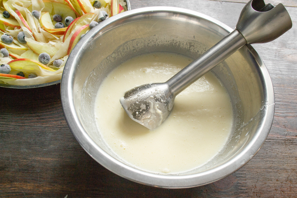 Погружным блендером или миксером смешиваем начинку до однородного состояния несколько минут. Получится жидкая заливка, чуть гуще теста для тонких блинчиков.
