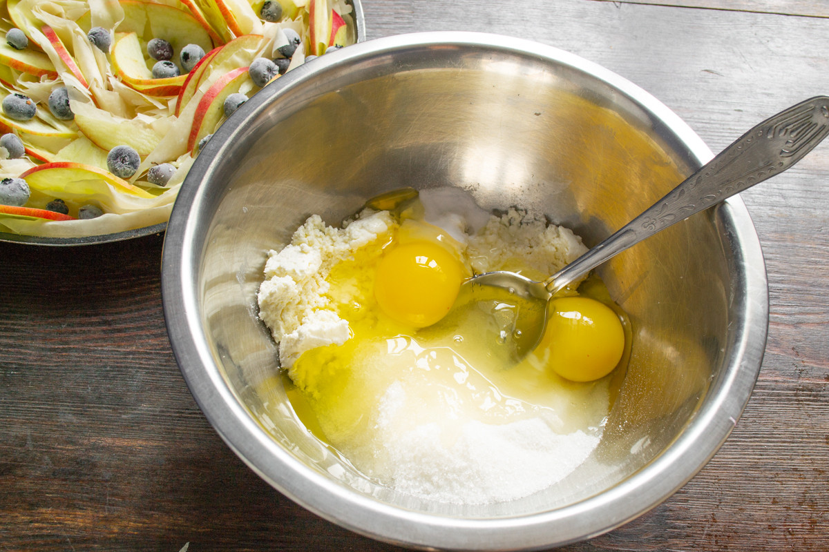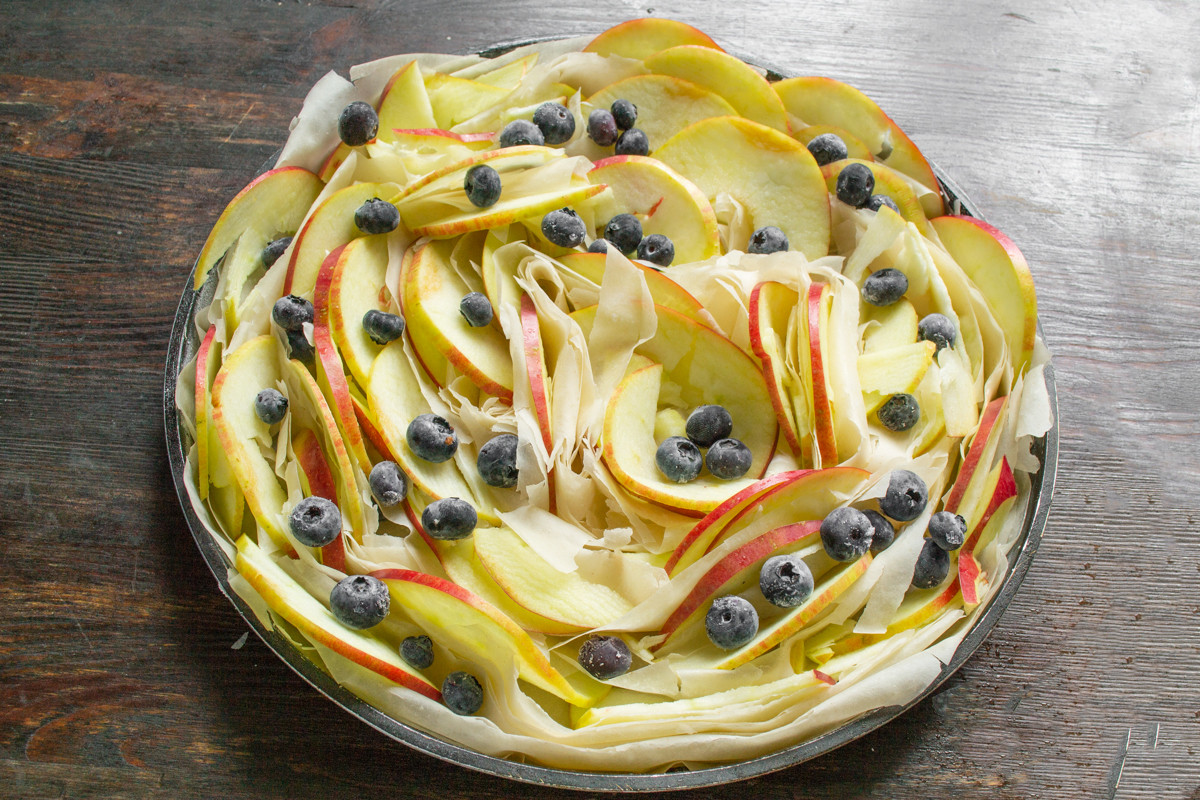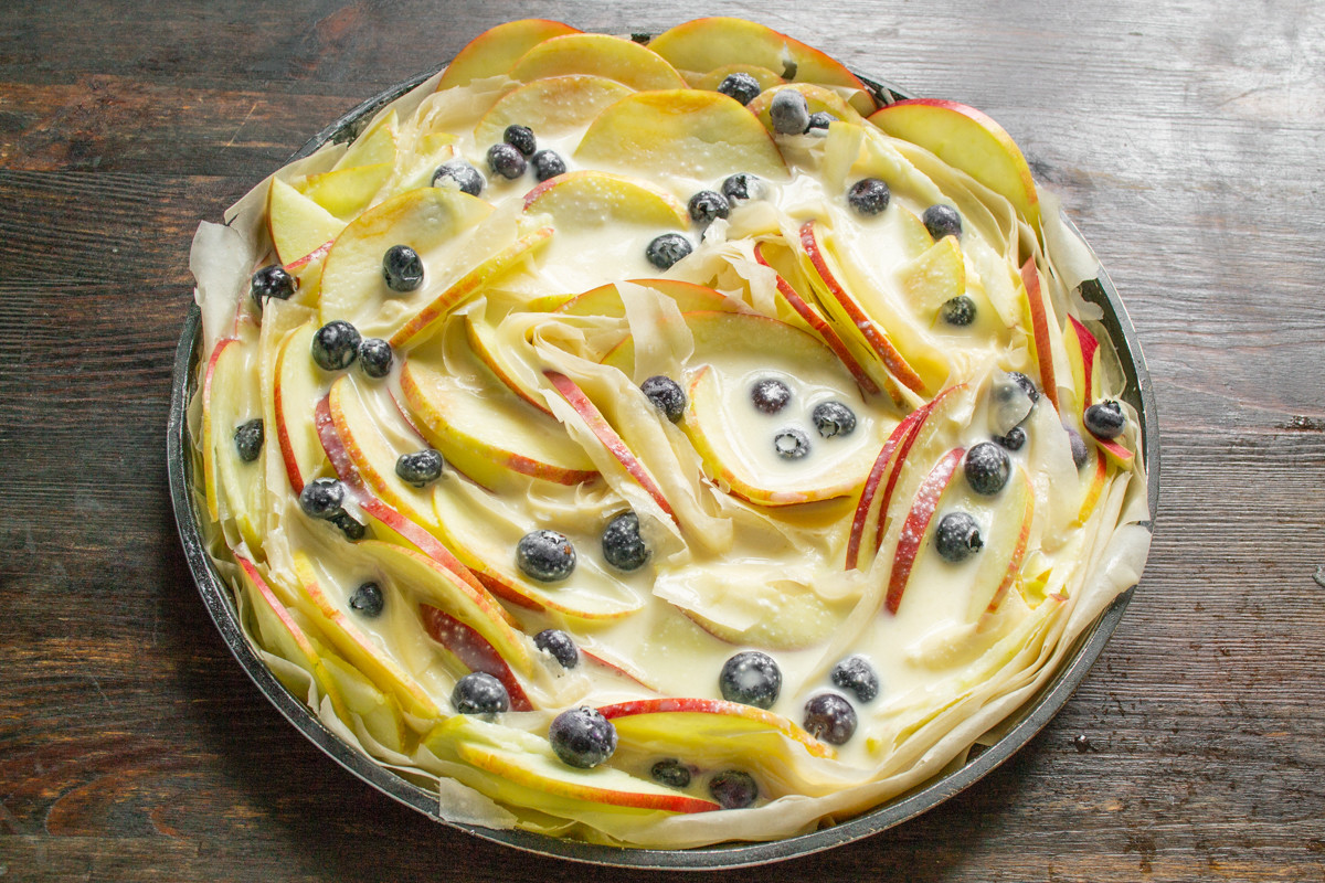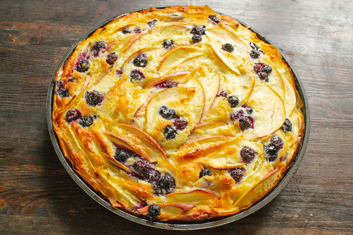 Пирог за полчаса вместе с выпечкой из готового теста фило. Простой пирог с голубикой и яблоками похож и на чизкейк, и на запеканку. Теста совсем мало, а яблок и ягод много!
