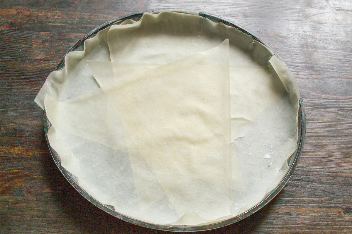 Форму диаметром 28 сантиметров или неглубокую сковороду с толстым дном смазываем размягченным сливочным маслом и посыпаем пшеничной мукой. Излишек муки стряхиваем. На дно формы кладем несколько листов теста фило. У меня тесто фило треугольниками, я укладываю листы в один слой внахлест. Круглые или прямоугольные листы нужно сложить по 2 шутки. Это будет донышко нашего пирога.