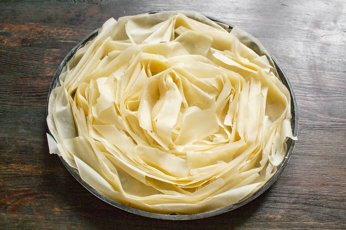 Хозяйке на заметку. Готовое вытяжное тесто фило очень тонкое и быстро засыхает на воздухе. Прикройте стопку с тестом влажным полотенцем, пока будете собирать пирог. Так тестоне высохнет.