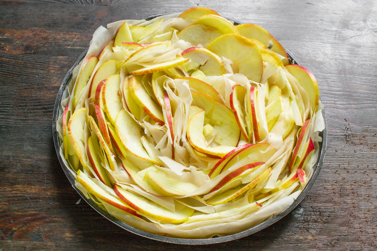 Вырезаем сердцевину из кисло-сладких яблок. Яблоки разрезаем пополам и нарезаем очень тонкими ломтиками. Вкладываем ломтики яблок в гармошки теста по кругу.