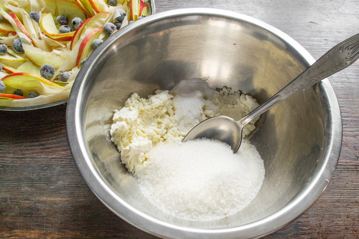 Готовим заливку. Кладем в глубокую миску творог, насыпаем сахарный песок, пшеничную муку и разрыхлитель теста. Добавляем ванилин или экстракт ванили по своему вкусу.