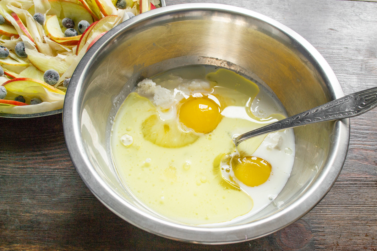 Выливаем заливку в форму. Наклоняем форму, чтобы жидкая масса равномерно растеклась между гармошками теста, замороженными ягодами и тонкими ломтиками яблок.