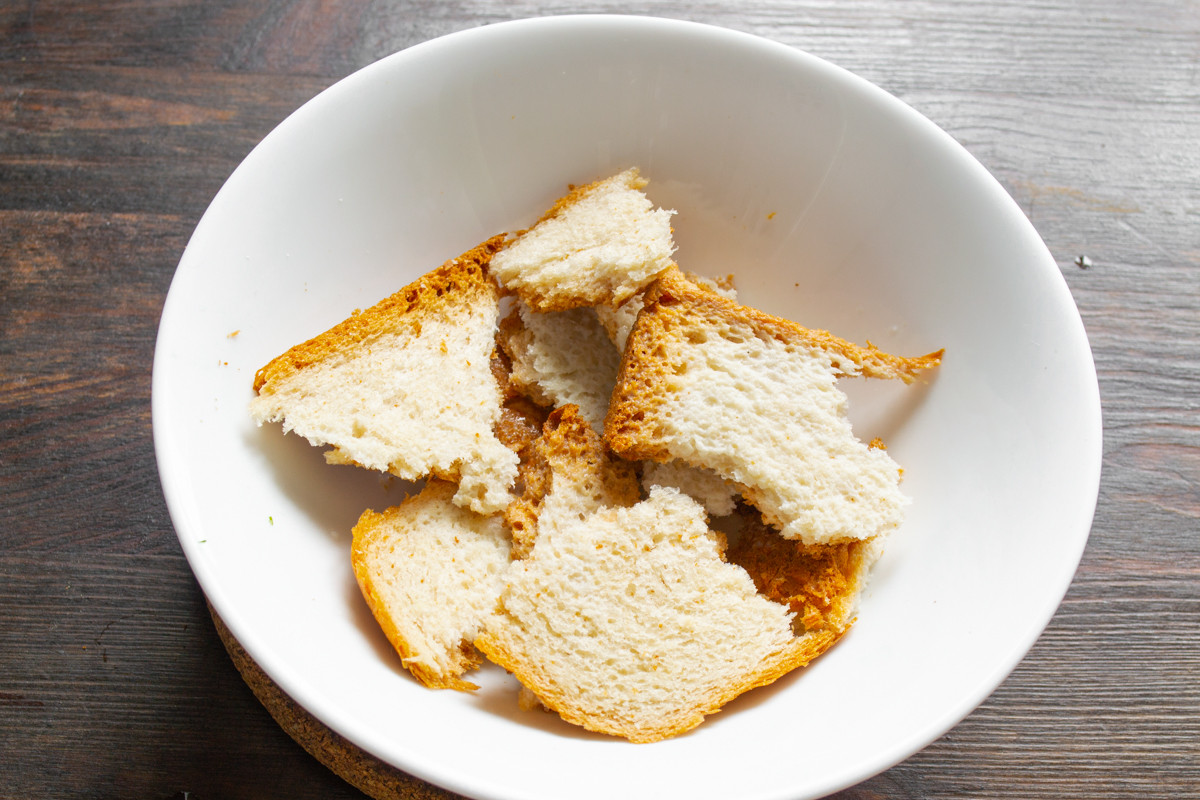 Готовим начинку для рулетиков. Тонкий ломтик вчерашнего белого хлеба поливаем холодным молоком или сливками, разминаем в кашицу. Корочку срезать не нужно, просто лучше разомните, чтобы не оставалось кусочков.