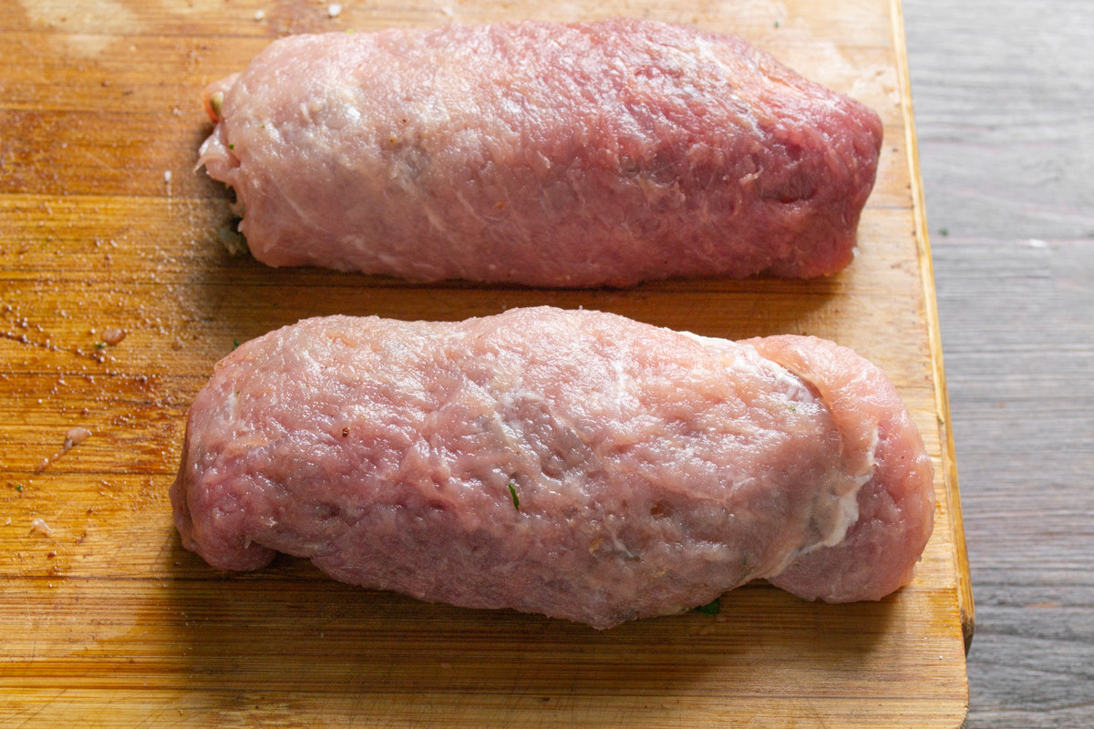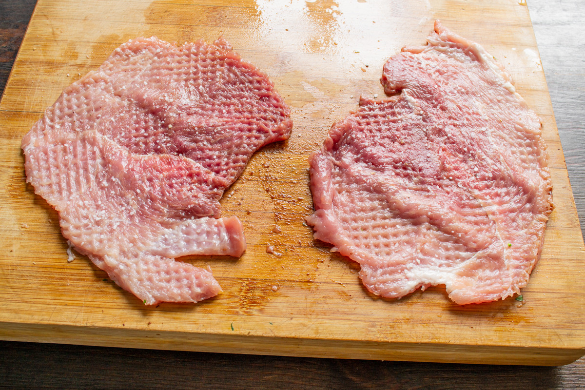 Начинку тщательно перемешиваем, по вкусу солим и перчим. По желанию можно заменить соль тертым пармезаном и добавить пропущенный через пресс зубчик чеснока. Берем два куска нежирной свинины для отбивных толщиной примерно 1 сантиметр. Накрываем мясо пищевой пленкой. Отбиваем мясным молоточком с двух сторон. Мясо нужно отбить как можно тоньше.