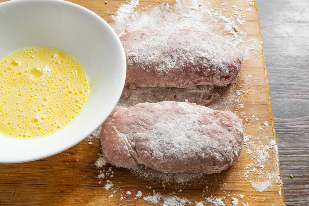 Аккуратно сворачиваем рулеты, кладем на разделочную доску швом вниз, подтыкаем края внутрь. По желанию можно сколоть деревянными зубочистками или шпажками. Панируем рулетики в муке, яйце и сухарях. Сначала посыпаем пшеничной мукой. Это первый слой панировки, к которому хорошо прилипает взбитое яйцо. Яйцо разбиваем в миску, смешиваем вилкой до однородного состояния.