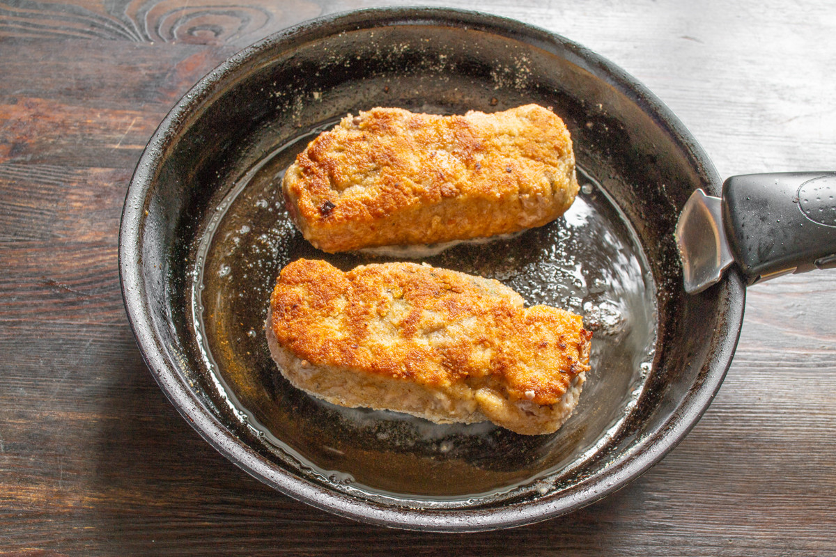 Обмакиваем рулетики в яйцо, затем в молотые сухари. Можно снова обмакнуть в яйцо и в сухари, чтобы слой панировки получился толстым. В сковороду наливаем 2-3 столовые ложки рафинированного растительного масла, хорошо нагреваем масло. Выкладываем рулетики на разогретую сковородку и обжариваем до золотистой корочки с двух сторон. Доводим до готовности в духовке, разогретой до 180 градусов по Цельсию. Понадобится примерно 15 минут. Перед подачей посыпаем зеленым луком, очень вкусно с картофельным пюре.