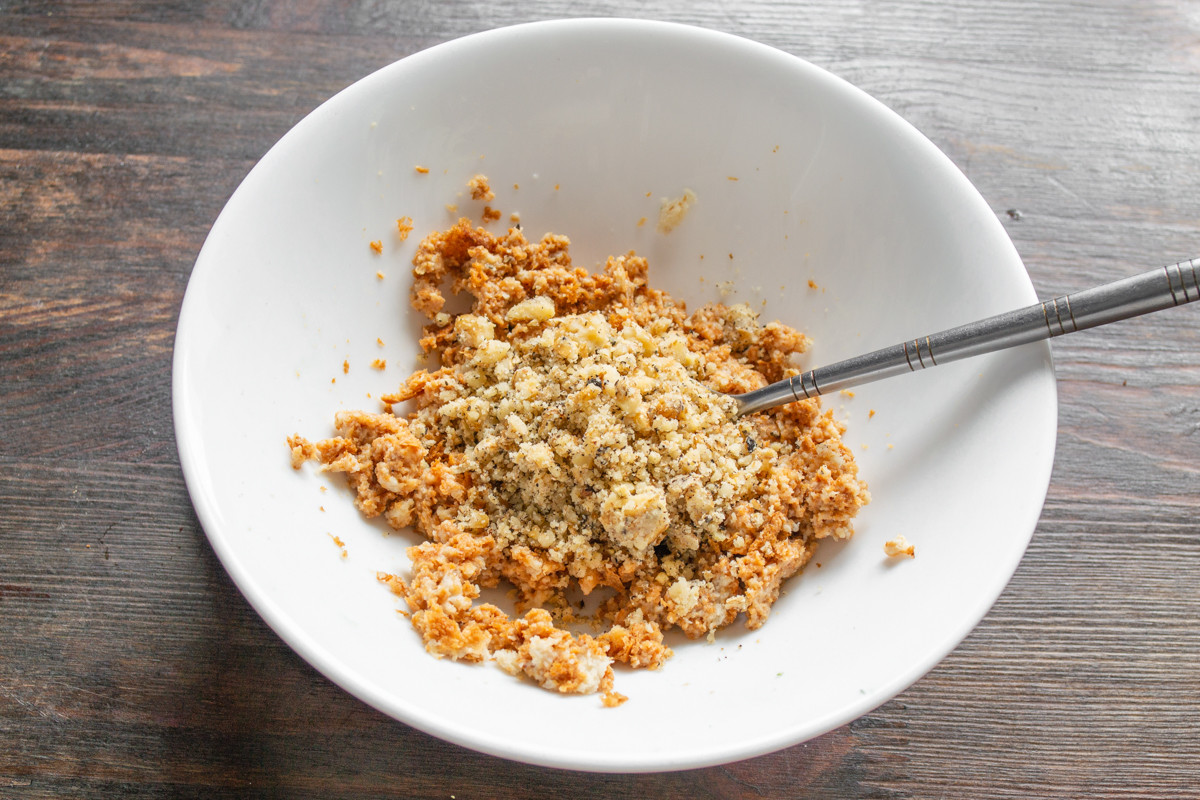 Грецкие орехи толчем в ступе или кладем в прочный пакет и измельчаем скалкой. Орехи нужно хорошо раскрошить и размять, чтобы выделилось ореховое масло. Измельченные орехи добавляем к хлебной кашице.